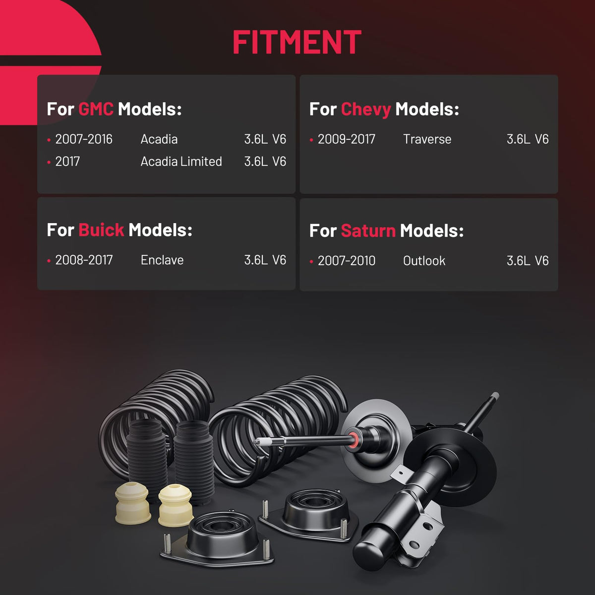 - 【Fitment information】:Shock Absorbers compatible with 2007-2016 GMC Acadia, 2017 Acadia Limited; compatible with 2008-2017 Buick Enclave; compatible with 2007-2010 Saturn Outlook; compatible with 2009-2017 Chevy Traverse.