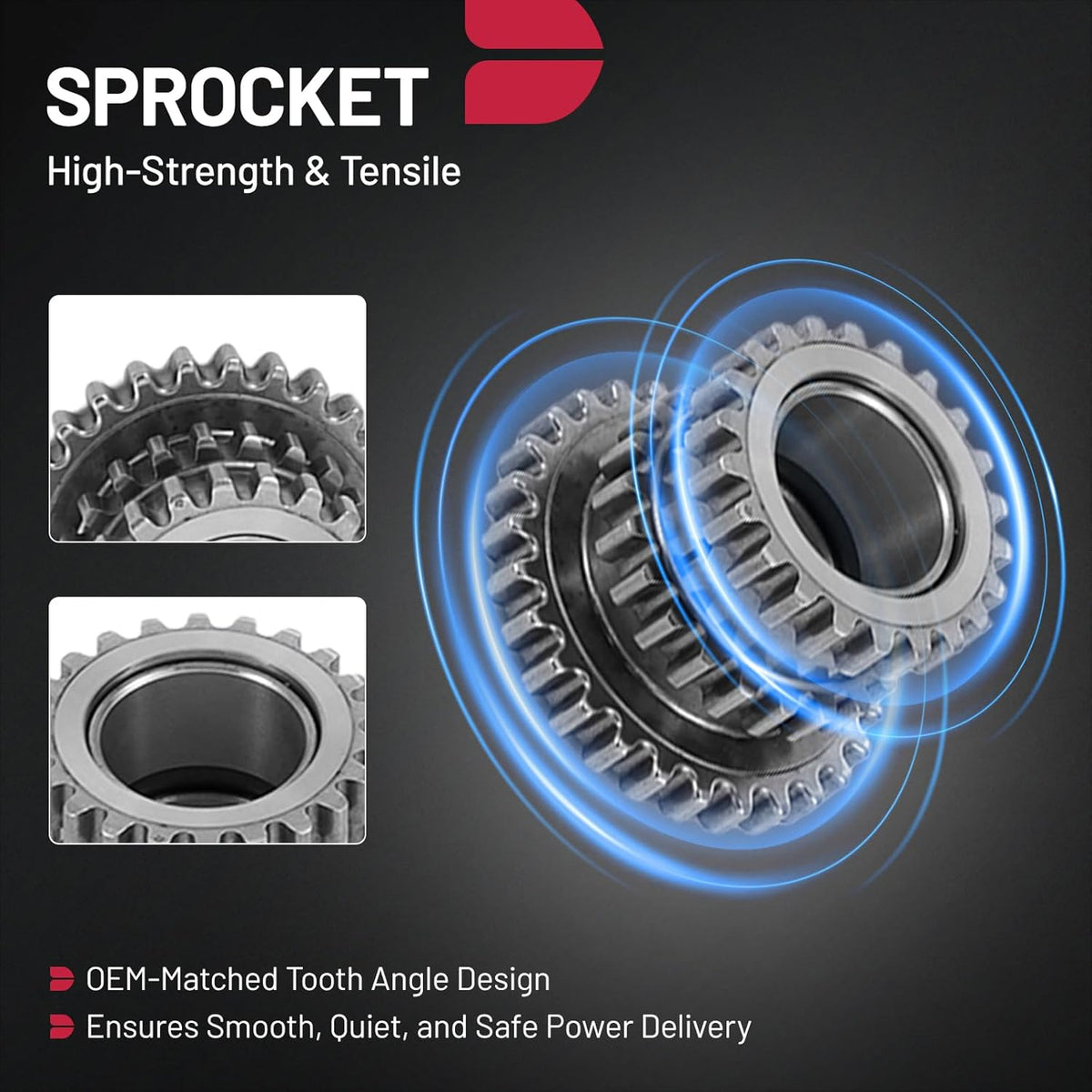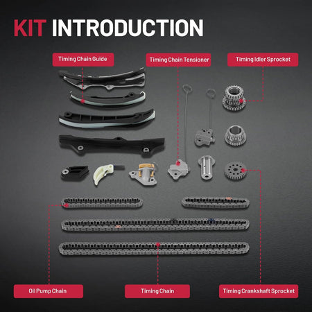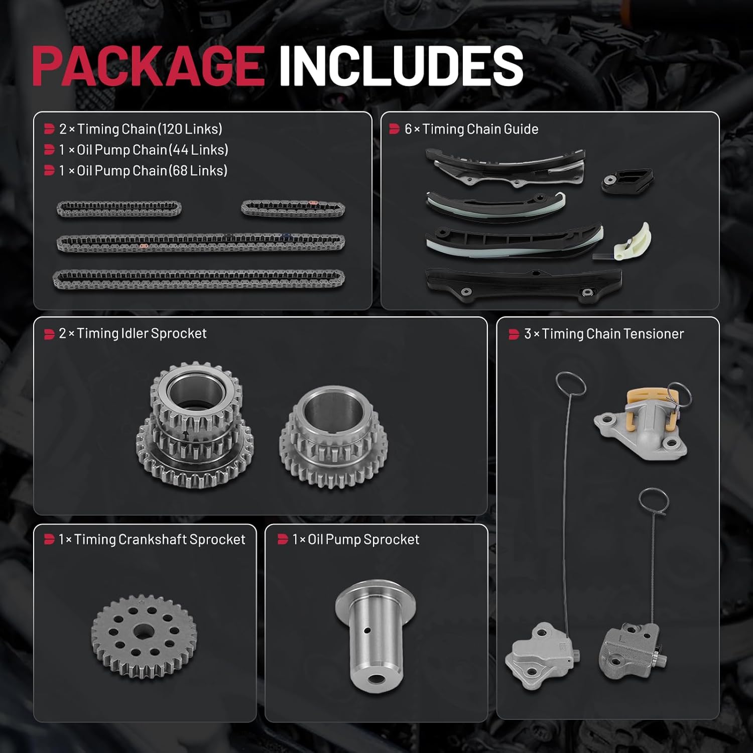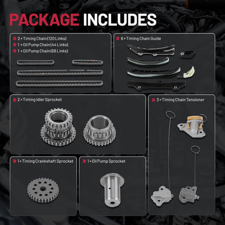 [Package Includes]: 2 x Timing Chain(120 Links), 1 x Oil Pump Chain(44 Links), 1 x Timing Crankshaft Sprocket, 2 x Timing Idler Sprocket, 3 x Timing Chain Tensioner, 6 x Timing Chain Guide, 1 x Oil Pump Sprocket