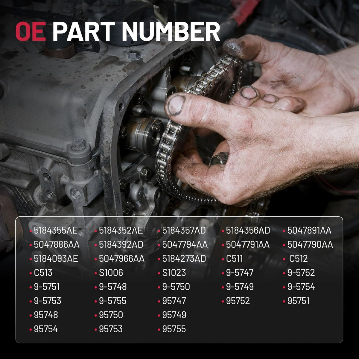 [Exact OE Fit]: This engine timing chain set replacement corresponds to the following OE part numbers: 5184355AE, 5184352AE, 5184357AD, 5184356AD, 5047891AA, 5047886AA, 5184392AD, 5047794AA, 5047791AA, 5047790AA, 5184093AE, 5047966AA, 5184273AD, C511, C512, C513, S1006, S1023, 9-5747, 9-5752, 9-5751, 9-5748, 9-5750, 9-5749, 9-5754, 9-5753, 9-5755, 95747, 95752, 95751, 95748, 95750, 95749, 95754, 95753, 95755
