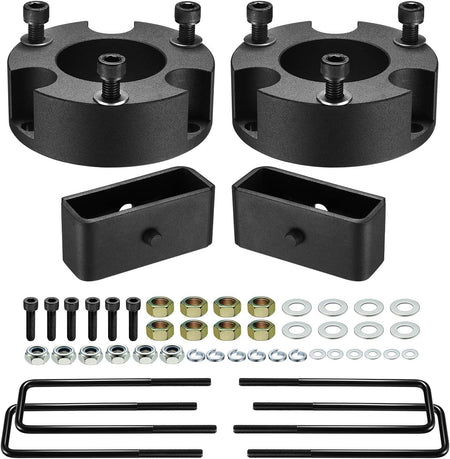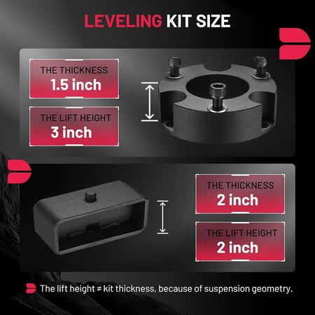 【Function】Improves the look of your vehicle and provides additional fender clearance for larger tires and wheels. With your truck's newly added height, your undercarriage will be a lot safer from damaging road obstacles. Note: The thickness of the front lift kit is 1.5", it will raise 3" at the front; the thickness of the rear is 2", it will raise 2" at the rear. This is due to suspension geometry, the ratio of the front lifting height to the thickness of the lift kit is not 1:1.
