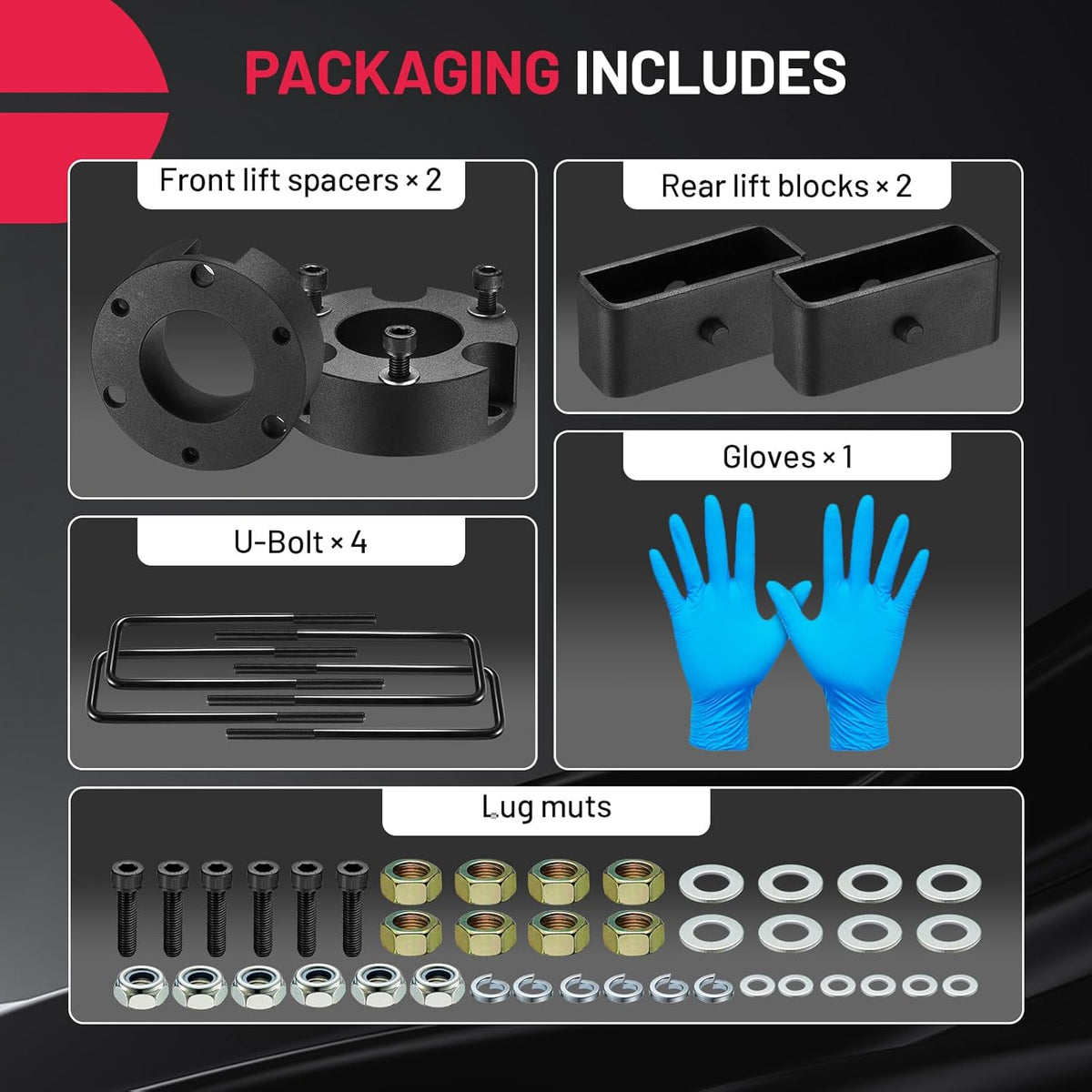 【Product Use】Generally, the car is not completely flat when driving on the road. Front lift kits are to raise the factory rake of your vehicle, make the front and rear of the car level. Increase the distance between the frame and the ground, make the vehicle look more perfect and cool. But it will never lessen your comfort level, making you more relaxed and enjoyable driving.