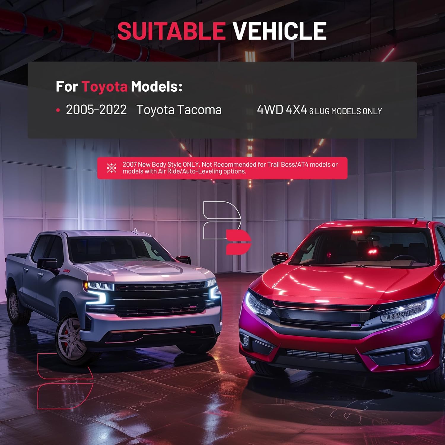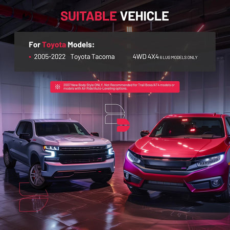 【Compatibility】BDFHYK 3" front and 2" rear leveling lift kit compatible with Toyota Tacoma 4WD 4X4 6 LUG MODELS ONLY 2005-2022. This set will raise the front of the truck by 3" and the rear of the truck by 2". Please make sure the size and compatible models when you purchase.