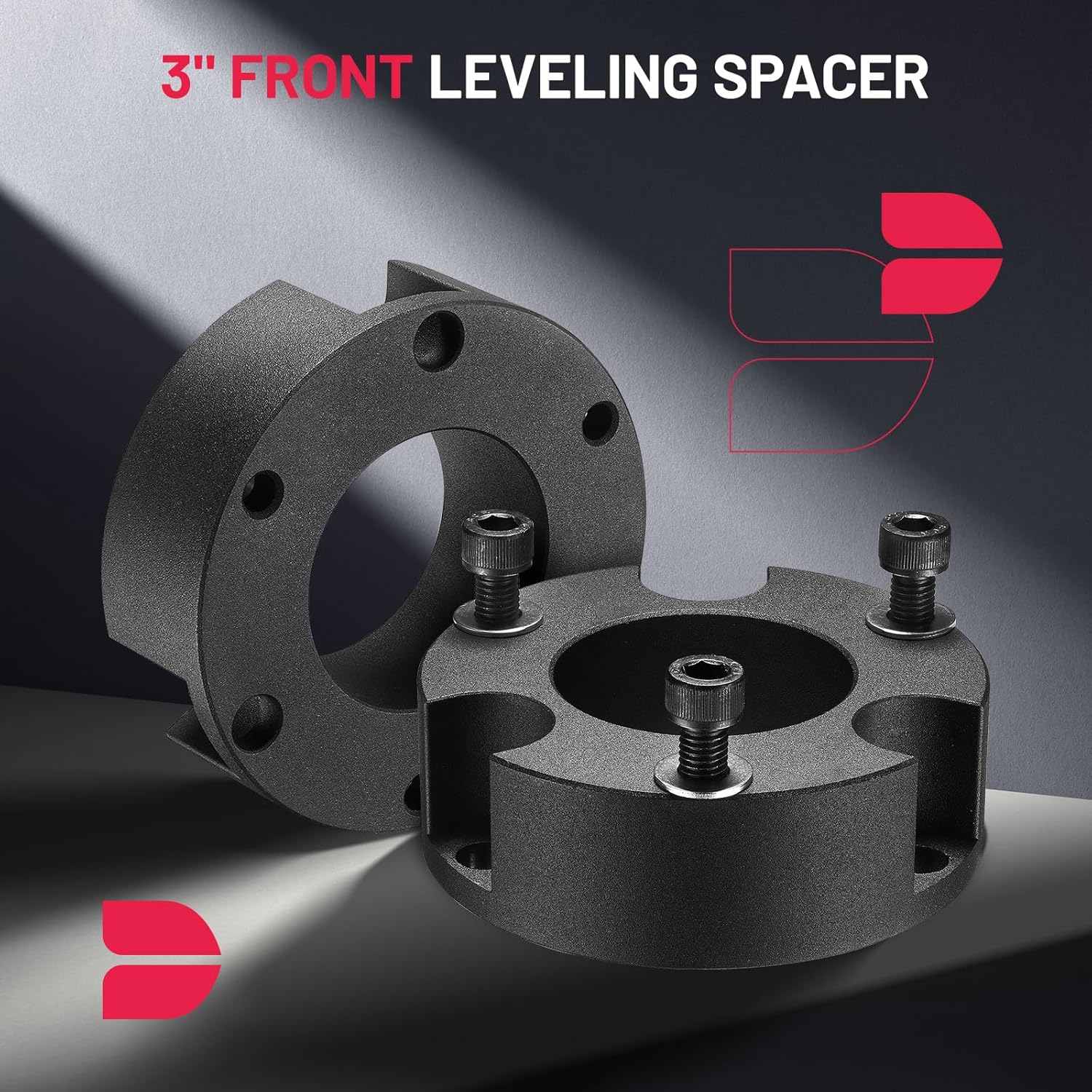 【Material】Strut lift spacers are CNC precision machined out of forged 6061-T6 aluminum alloy, the adapter specially powder black coated for a great look that will offer better corrosion resistance and last the life. 12.9 grade solid bolts extremely strong and durable without compressing or warping over time.