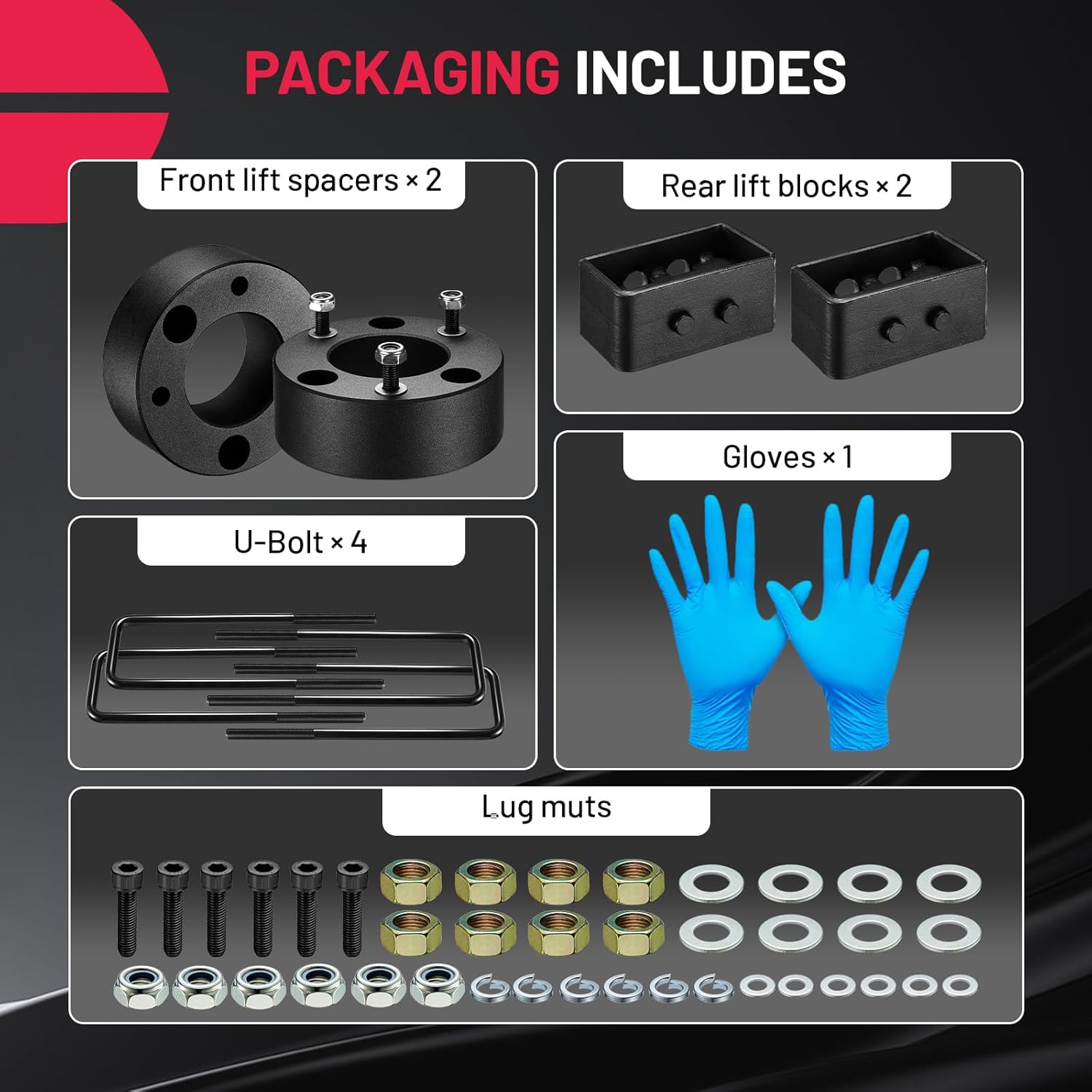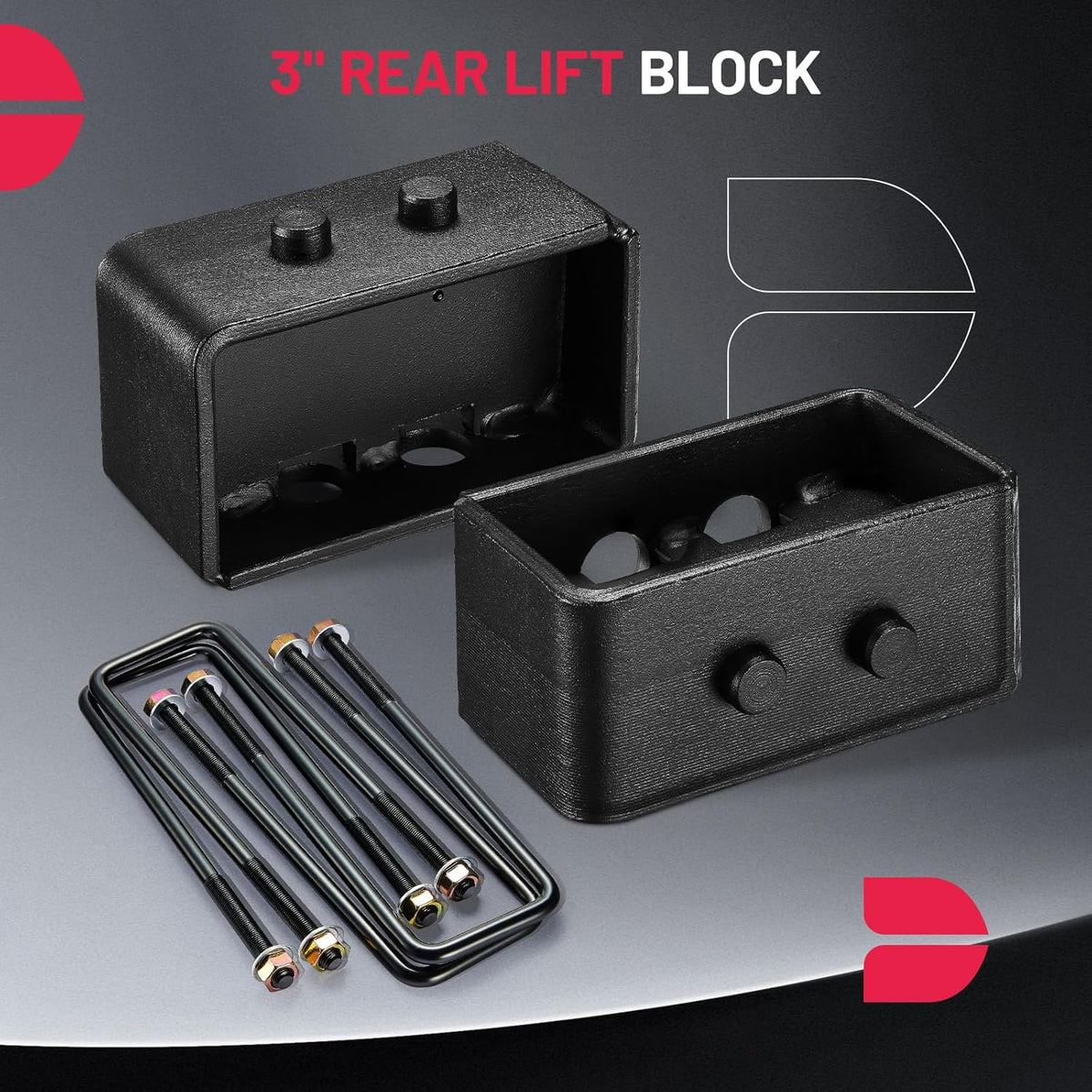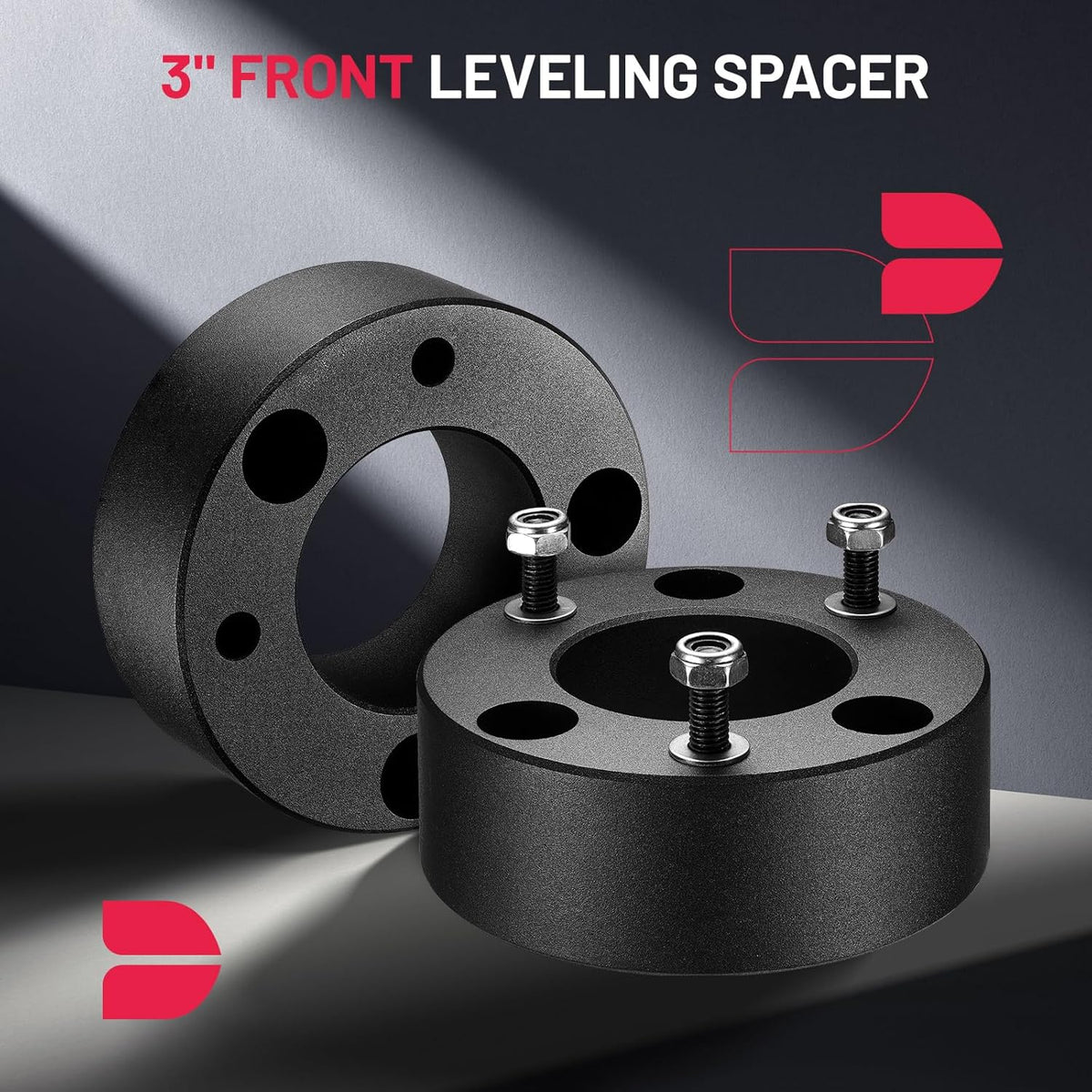【Function】Improves the look of your vehicle and provides additional fender clearance for larger tires and wheels. With your truck's newly added height, your undercarriage will be a lot safer from damaging road obstacles. Note: The thickness of the leveling Lift Kit will raise your truck by 3 inches at the rear and 3 inches at the front. The ratio of the front lifting height to the thickness of the lift kit is not 1:1, this is due to suspension geometry.