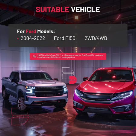 【Compatibility】BDFHYK 3" front and 3" rear leveling lift kit compatible with Ford F150 2WD 4WD 2004-2022. This set will raise the front of the truck by 3" and the rear of the truck by 3". Please make sure the size and compatible models when you purchase.
