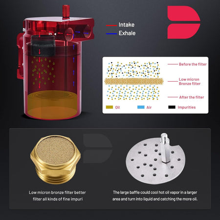 Baffled Design: The oil catch can features a baffle system that can be easily disassembled by rotating. By adding steel balls, you can increase the surface area for steam condensation, making it more efficient at capturing oil and moisture from engine vapors