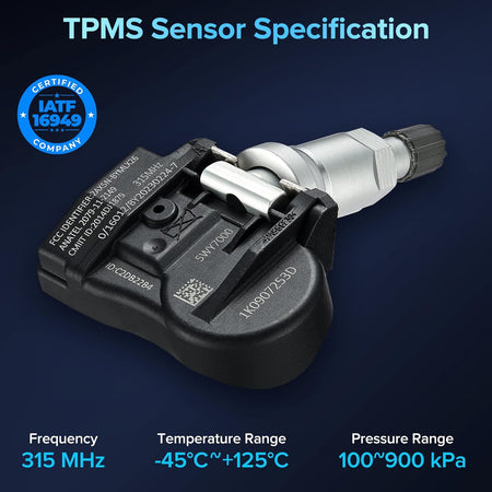 [ ]-This Tire Pressure Monitoring sensor is made from quality components to ensure the reliability, durabilitiy and safety of TPMS. Automotive-grade battery for long service life for over 3 years of normal use, Cutting-edge technology chip best signal strength real-time reading. High temperature resistance (257°F) and low temperature (-49°F) ensure the safety of your car even under harsh conditions.