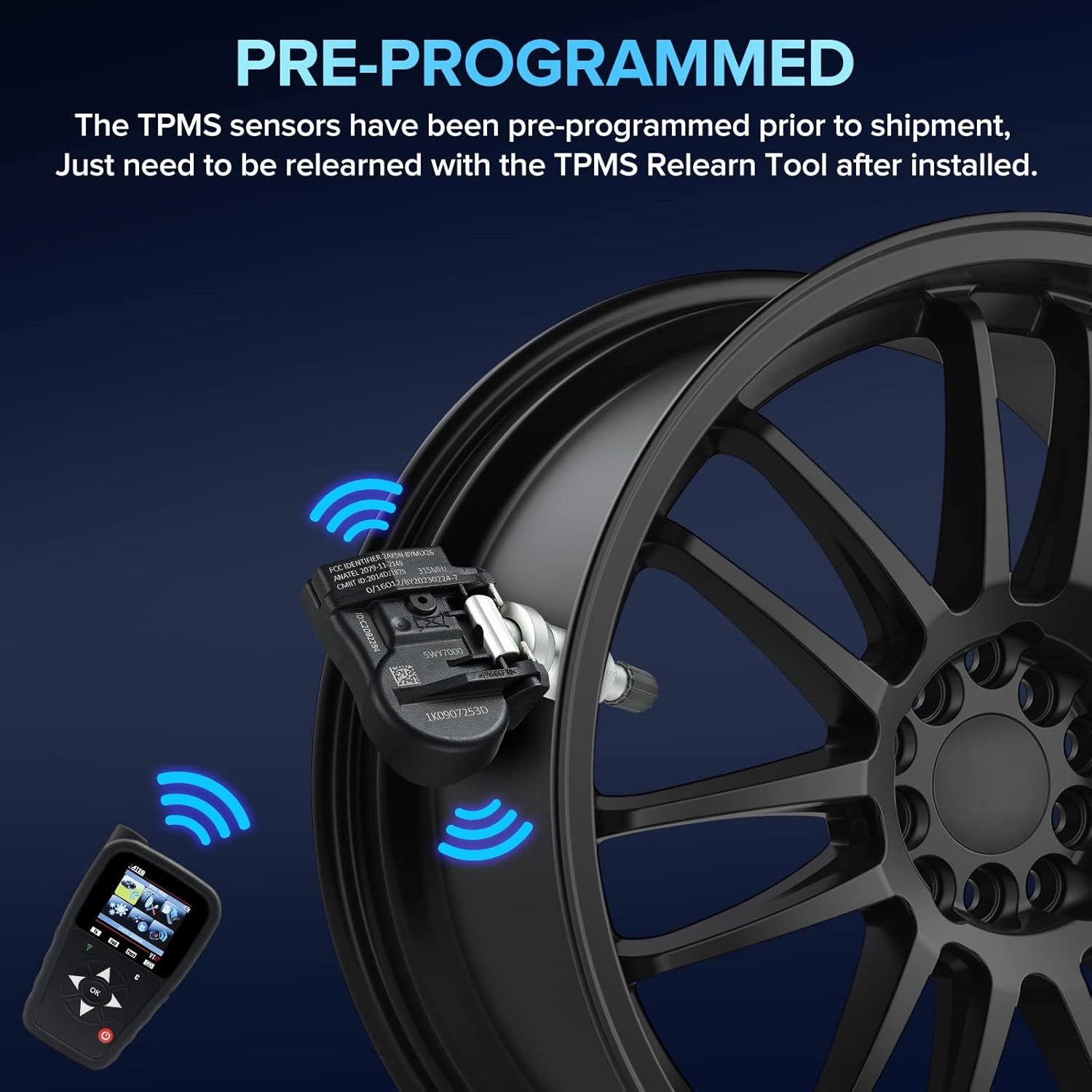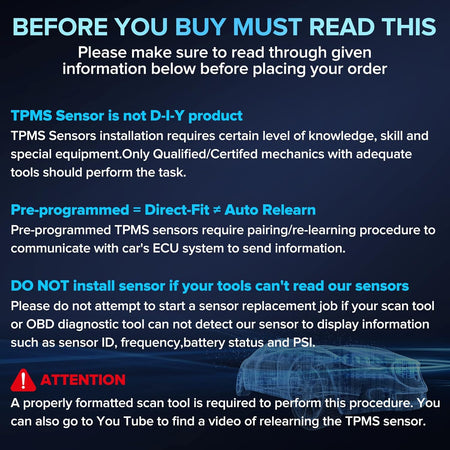 [ ]-Our preprogrammed tire sensor comes ready to be paired to compatible vehicle, just need to pair and relearn after installation. please refer to standard relearn procedure specified on the user guide included.