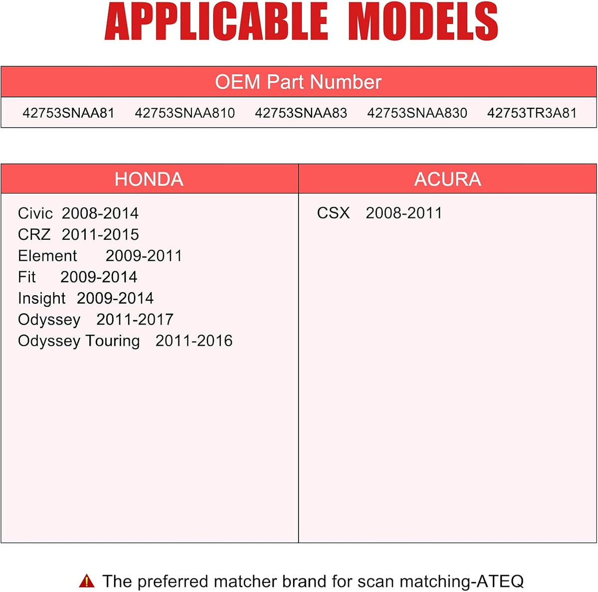 []-The TPMS is Brand new Compatible with Compatible with Honda: 2008-2014 Civic, 2011-2015 CR-Z, 2009-2011 Element, 2009-2014 Fit, 2009-2014 Insight, 2011-2017 Odyssey, 2008-2011 Acura CSX