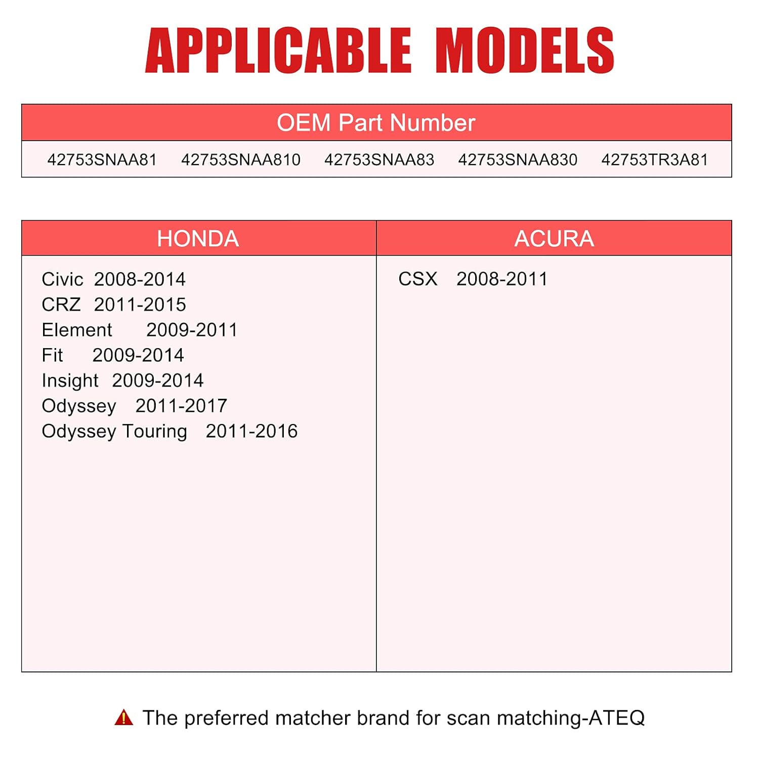 []-The TPMS is Brand new Compatible with Compatible with Honda: 2008-2014 Civic, 2011-2015 CR-Z, 2009-2011 Element, 2009-2014 Fit, 2009-2014 Insight, 2011-2017 Odyssey, 2008-2011 Acura CSX