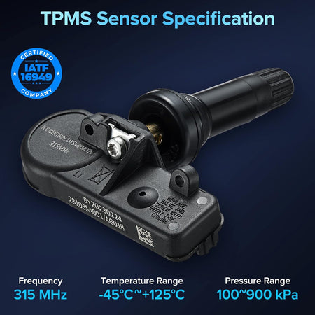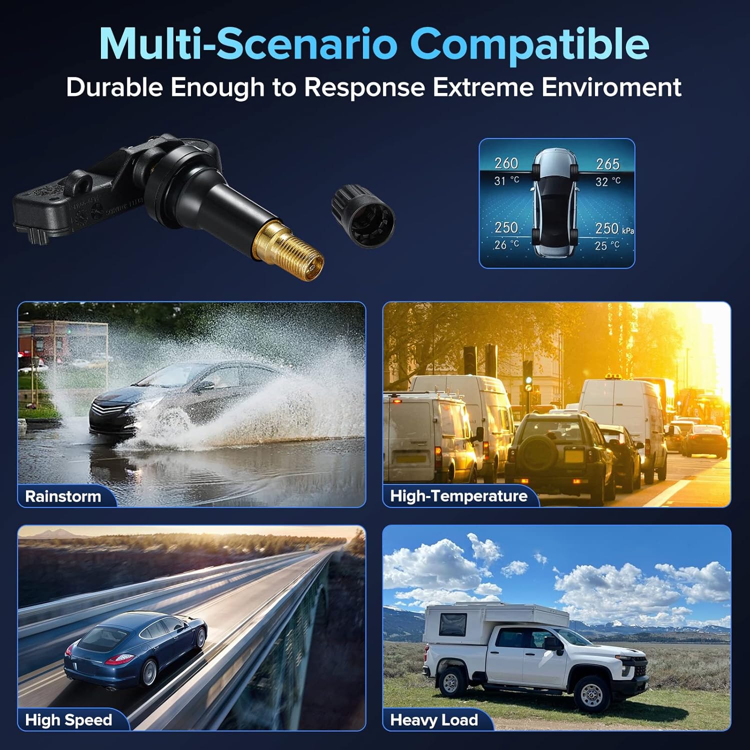 [ ]-This Tire Pressure Monitoring sensor is made from quality components to ensure the reliability, durabilitiy and safety of TPMS. Automotive-grade battery for long service life for over 3 years of normal use, Cutting-edge technology chip best signal strength real-time reading. High temperature resistance (257°F) and low temperature (-49°F) ensure the safety of your car even under harsh conditions.