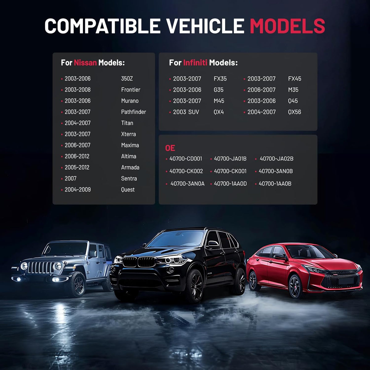 Fitment: Compatible with 2003-2006 Nissan 350Z, 2003-2008 Nissan Frontier, 2003-2006 Nissan Murano, 2003-2007 Nissan Pathfinder, 2004-2007 Nissan Titan, 2003-2007 Nissan Xterra, 2006-2007 Nissan Maxima, 2006-2012 Nissan Altima, 2005-2012 Nissan Armada, 2007 Nissan Sentra, 2004-2009 Nissan Quest. Replace Part Numbers: 40700-CD001 40700-JA01B 40700-JA02B 40700-CK002 40700-CK001 40700-3AN0B 40700-3AN0A 40700-1AA0D 40700-1AA0B.