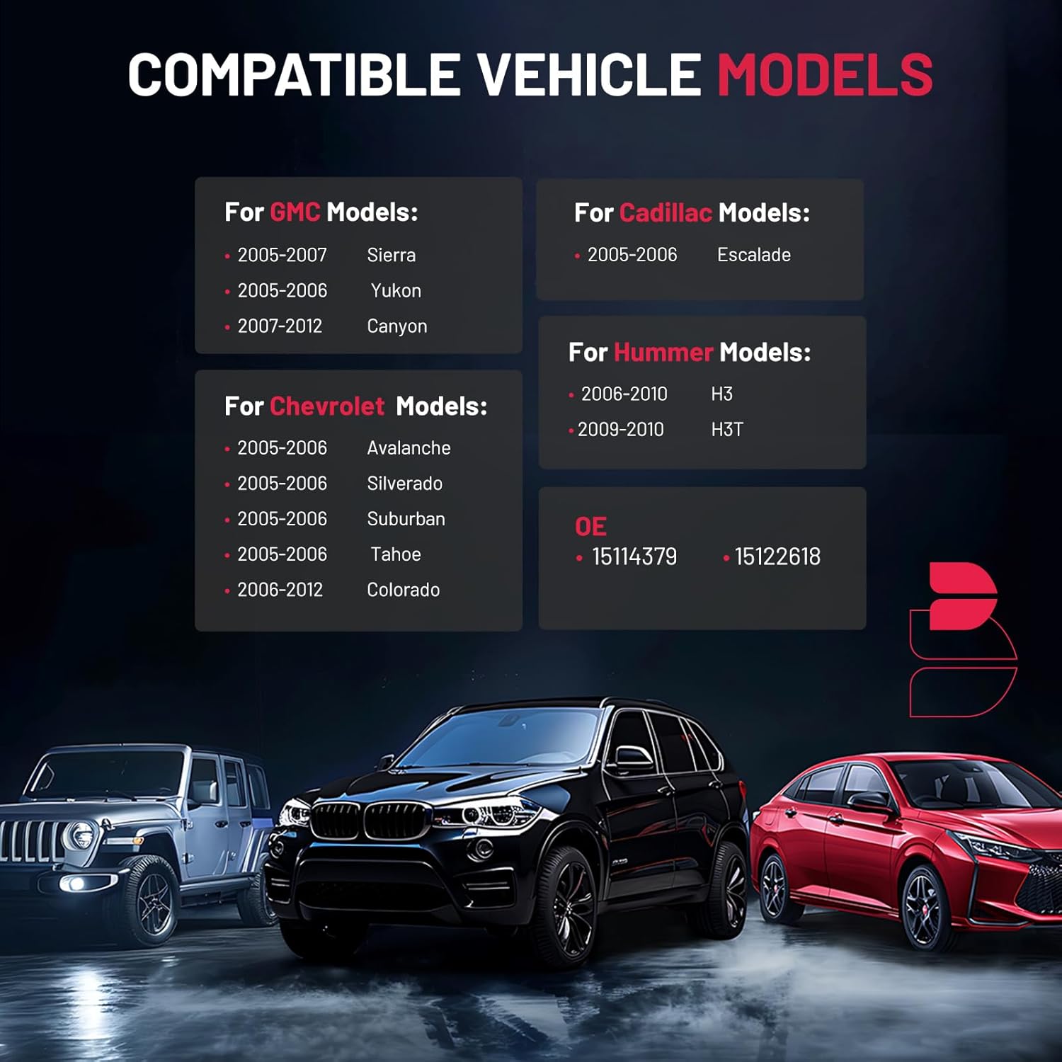 Fitment: This 100% brand new tire pressure monitor system (TPMS) is compatible with Cadillac Escalade 2005-2006, compatible with Chevrolet Avalanche 2005-2006, 2005-2006 Silverado, 2005-2006 Suburban, 2005-2006 Tahoe, 2006-2012 Colorado, Compatible with GMC: Sierra 2005-2007, 2005-2006 Yukon, 2007-2012 Canyon, Compatible with Hummer H3 2006-2010, 2009-2010 H3T. Please refer to the product description below for the complete list of compatible models and years