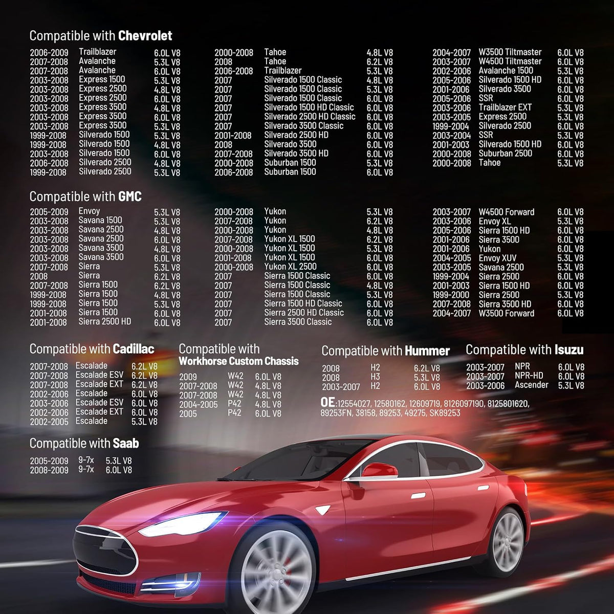 【COMPATIBLE VEHICLES 2】---Our drive belt tensioners are fitting for 2005-2009 GMC Envoy(XL)(XUV);2003-2008 GMC Savana 1500/2500/3500;2007-2008 GMC Sierra(1500 Classic);2001-2006 GMC Sierra 1500HD (Classic);1999-2004 GMC Sierra 2500/3500 HD (Classic);2004-2007 GMC W3500/W4500 Forward;2003-2007 GMC W4500 Forward;2000-2008 GMC Yukon(XL 1500/2500);2004-2007 Buick Rainier;2003-2006 Isuzu Ascender( NPR/NPR-HD);2007-2008 Workhorse W42(Custom Chassis P42/W42);2005-2009 Saab 9-7x.