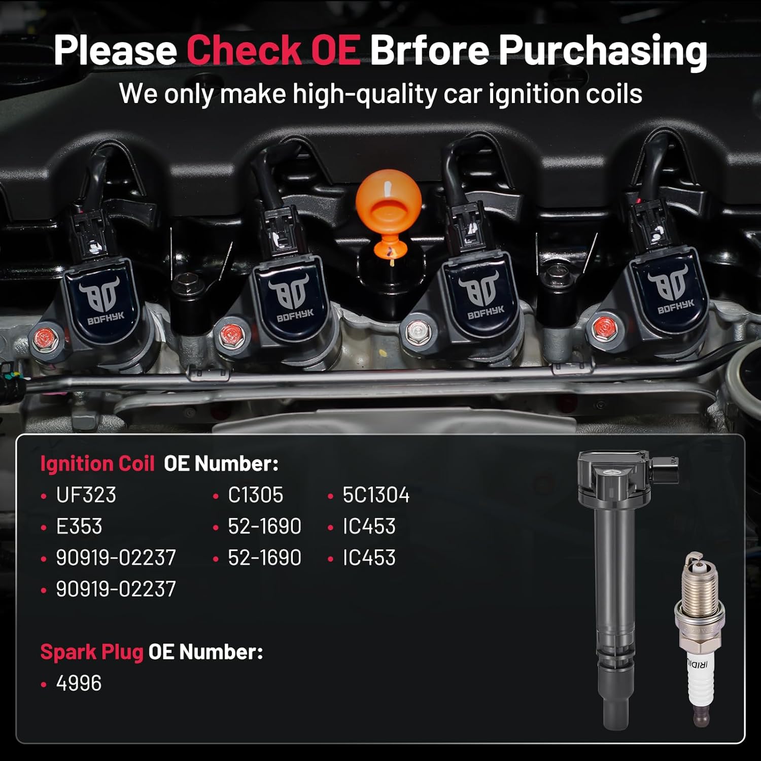 【Yes, you need a new coil and spark plug!】If your car has been used for a long time(over 80000km) and has problems like car shaking, start-up failure, speeding up slowly, and increasing fuel consumption, you may need to change a new set of spark plugs and coil packs. BDFHYK ignition coil packs and spark plugs can offer you a professional user experience and make your car like new. You may choose it with confidence.