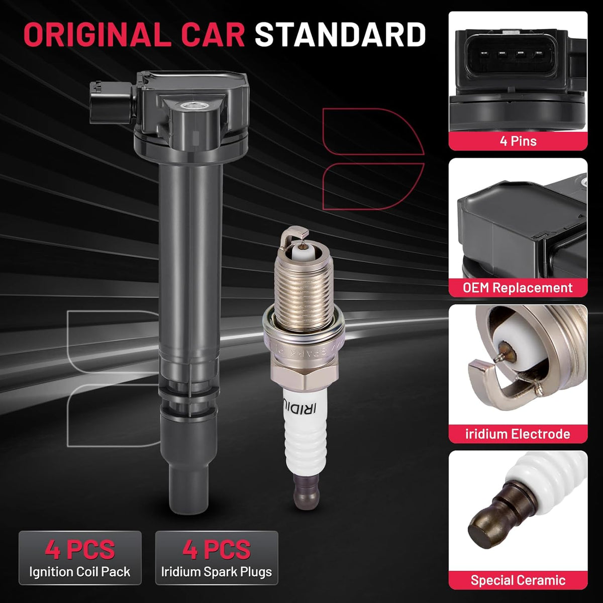 BDFHYK 4 Ignition Coil Pack UF323 and 4 Iridium Spark Plug 4996 Compatible with Toyota 2000-2004 Tacoma 2.4L 2.7L l4, 2000 4Runner 2.7L l4 Coil for 5C1304
