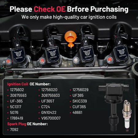 - OE Number Ignition coil Replace# 1275602, 12756020, 12756029, 30875593, 308755933, UF365, UF-365, UF365T, SKIC339, 5C1317, C724, CUF365, 5076, GN10422, 48661, 1788419, V95700007; Spark plug Replace#7092