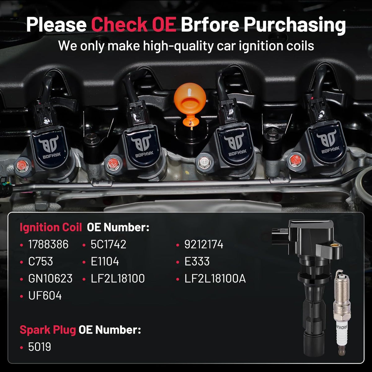 【About BDFHYK】A professional auto parts manufacturer with mature industry lines. We have our factory and experienced developer. It's been more than 10 years that we have served different customers from different areas. We do our best to hear from customers and update our coil packs and spark plugs. If you have more problems, please be free to contact us. Choose BDFHYK,choose good service.