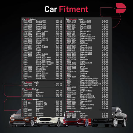 【Compatibility Information】:Spark Plug 41-110 Compatible with Buick Allure LaCrosse Rainier; Compatible with Cadillac CTS Escalade Escalade ESV EXT; Compatible with Chevy Avalanche Camaro Caprice Colorado Corvette Express Impala Monte Carlo Silverado SS SSR Suburban Tahoe Trailblazer; Compatible with GMC Canyon Envoy Savana Sierra Yukon; Compatible with Hummer H2 H3; Compatible with Pontiac Firebird G8 Grand Prix GTO.Please see images or details page for complete Compatibility information.
