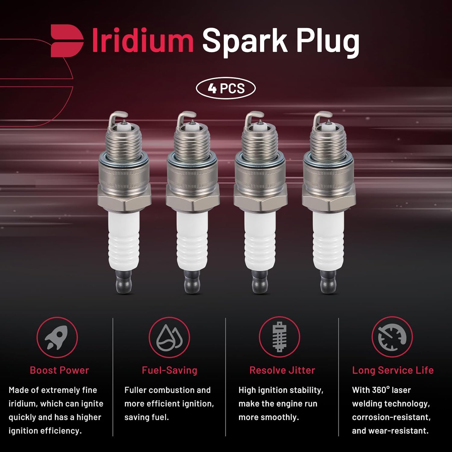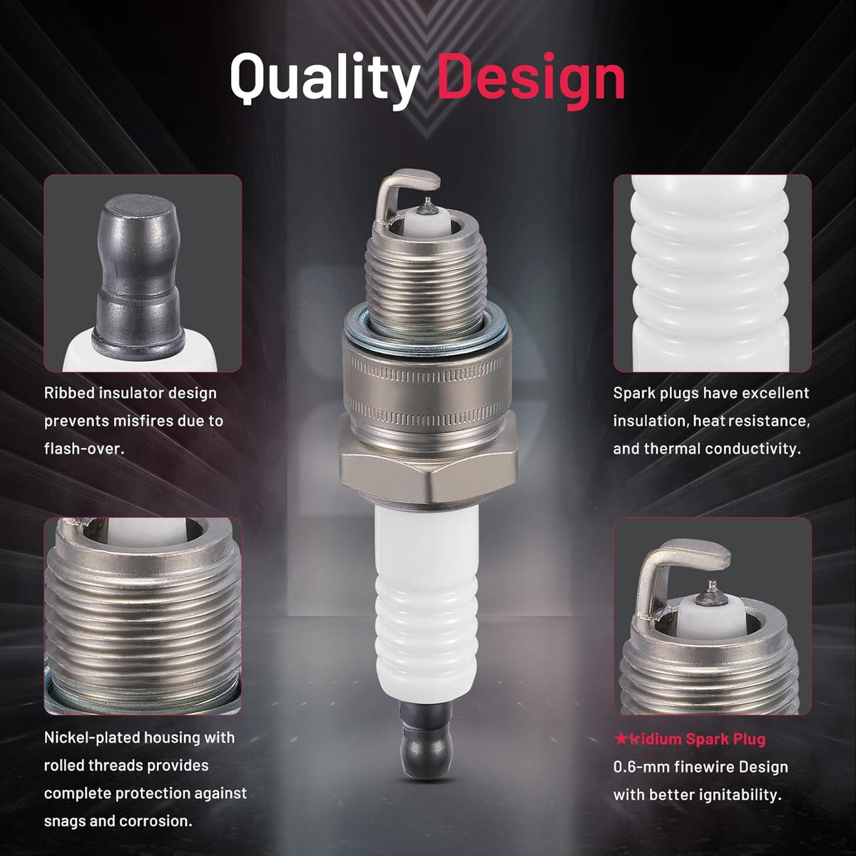 【Spark plug specification】:(1)Center Electrode Material:Iridium.(2)Thread Diameter:14mm.(3)Hexagonal-to-Edge Size:20.4mm.(4)Thread Length:12.7mm.(5)Spark Gap:1.0mm.(6)Calorific Value:8