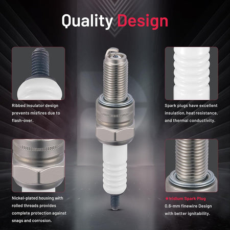 【Spark plug specification】:(1)Center Electrode Material:Iridium.(2)Thread Diameter:10mm.(3)Hexagonal-to-Edge Size:15.8mm.(4)Thread Length:19mm.(5)Spark Gap:0.6mm.(6)Calorific Value:9