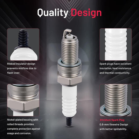 【Spark plug specification】:(1)Center Electrode Material:Iridium.(2)Thread Diameter:12mm.(3)Hexagonal-to-Edge Size:17.4mm.(4)Thread Length:19mm.(5)Spark Gap:0.9mm.(6)Calorific Value:8