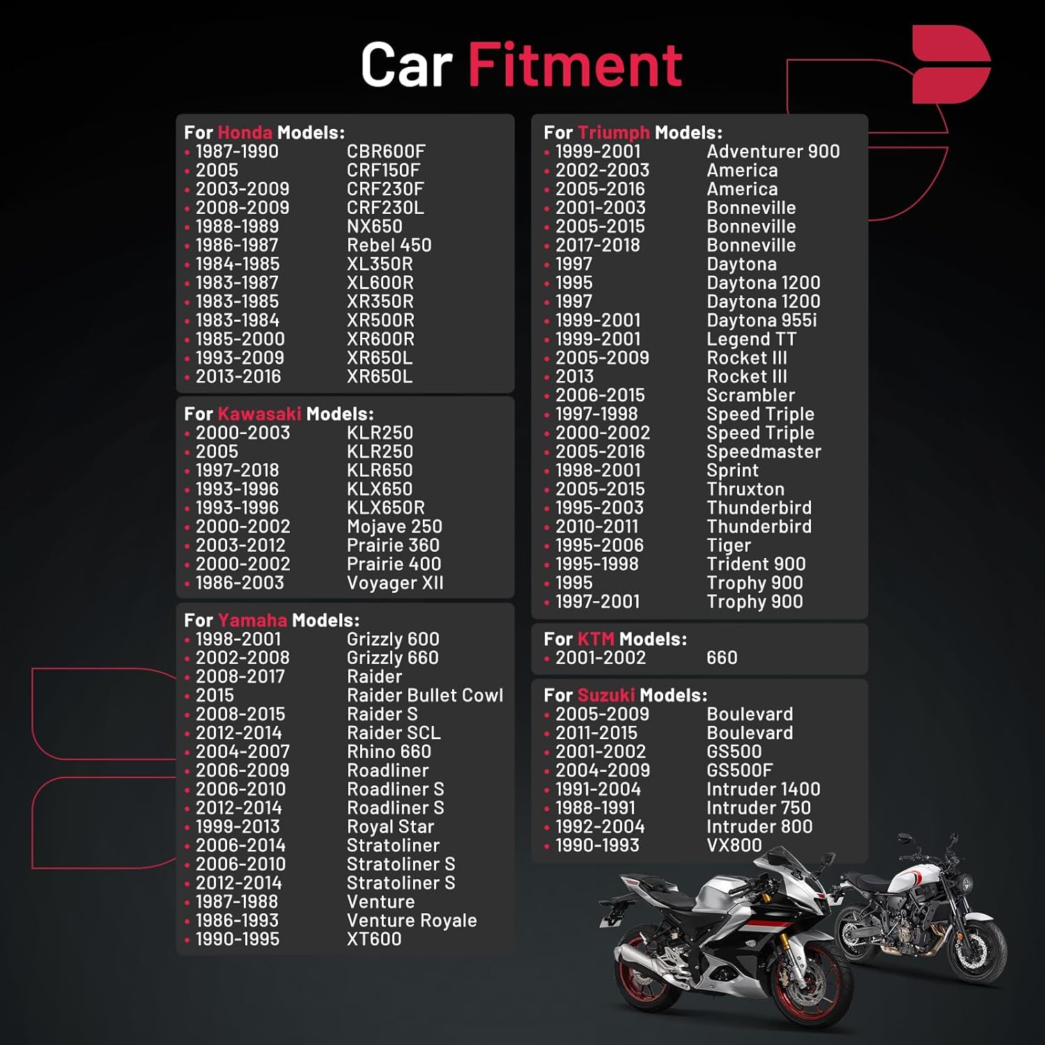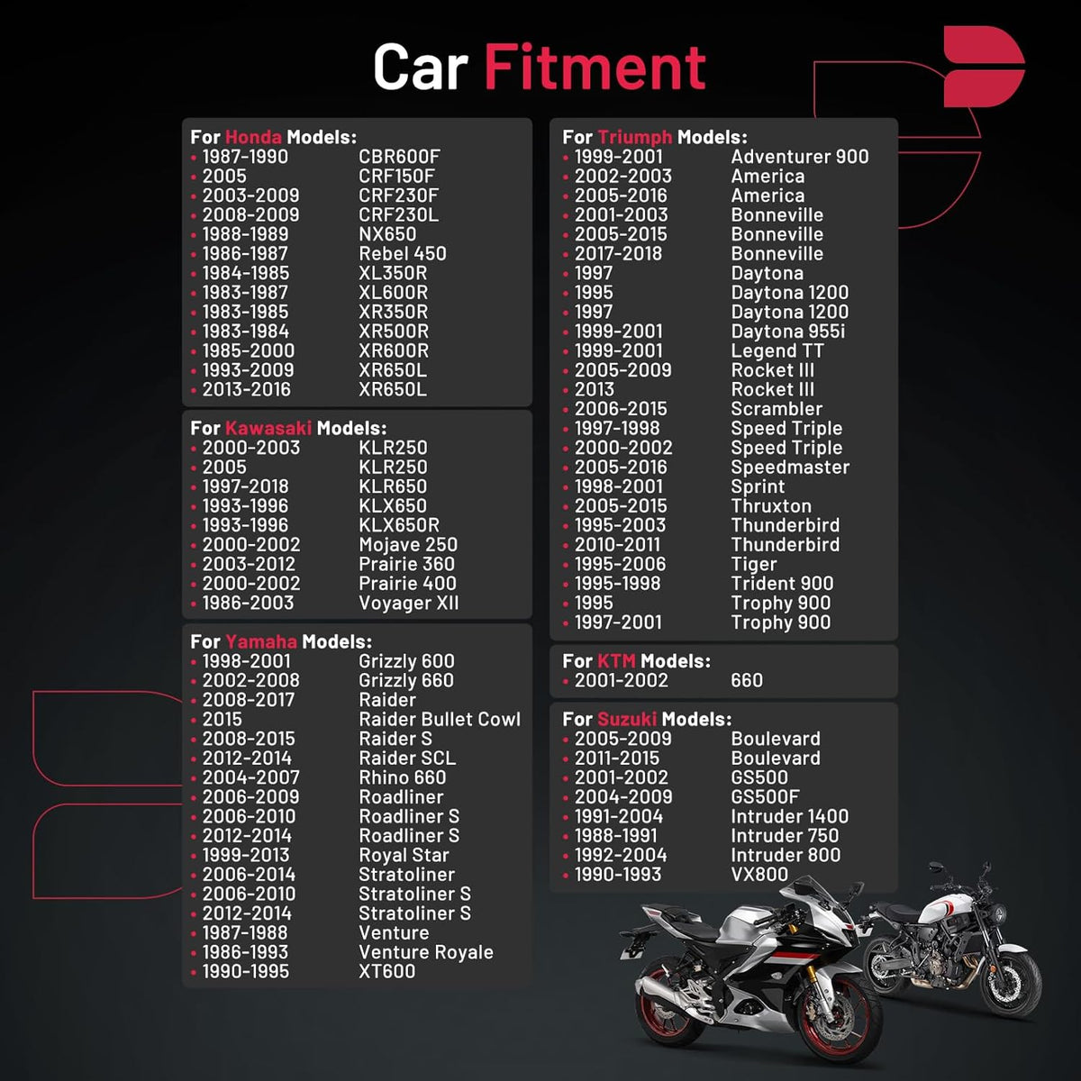 【Compatibility Information】:Universal Spark Plug 4929 fit for Honda CBR600F CRF150F NX650 Rebel 450 XL350R XL600R; fit for Kawasaki KLR250 KLX650R Mojave 250 Prairie 360 Voyager XII; fit for KTM 660; fit for Suzuki Boulevard GS500 GS500F Intruder 1400 Intruder 750 Intruder 800 VX800; fit for Triumph Adventurer 900 America Bonneville Daytona Daytona 1200 Daytona 955i ; fit for Yamaha Grizzly 600 Grizzly 660 Raider Raider.Please see images or details page for complete Compatibility information