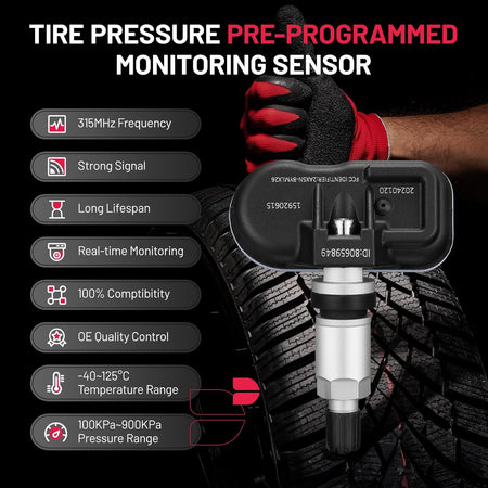 【High Performance & Reliability】: This Programmed TPMS Sensor is built with premium-grade components to ensure exceptional reliability, durability, and safety. Equipped with an automotive-grade battery providing a service life of over 3 years under normal use. Advanced chipset delivers strong signal stability and accurate real-time pressure readings. Engineered to withstand extreme temperatures from -49°F to 264°F, offering consistent performance even in harsh environments