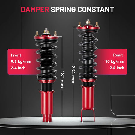【Coil Spring Rate】: The lowering height ranges from 2 to 4 inches, with adjustable spring and shock absorber brackets that enable drivers to easily customize the vehicle's suspension height. Front Spring Rate: 9.8kg/mm(549 lbs/in). Rear Spring Rate: 5kg/mm(280 lbs/in). Front Spring Length: 180mm & Rear Spring Length: 234mm