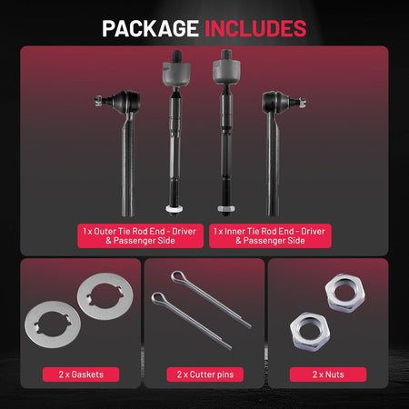 Tie Rod Ends Kit Include:1 x ES800224 Front Outer Tie Rod End - Driver & Passenger Side, 1 x EV800226 Front Inner Tie Rod End - Driver & Passenger Side, 2 x Nuts, 2 x Cutter pins, 2 x Gaskets.