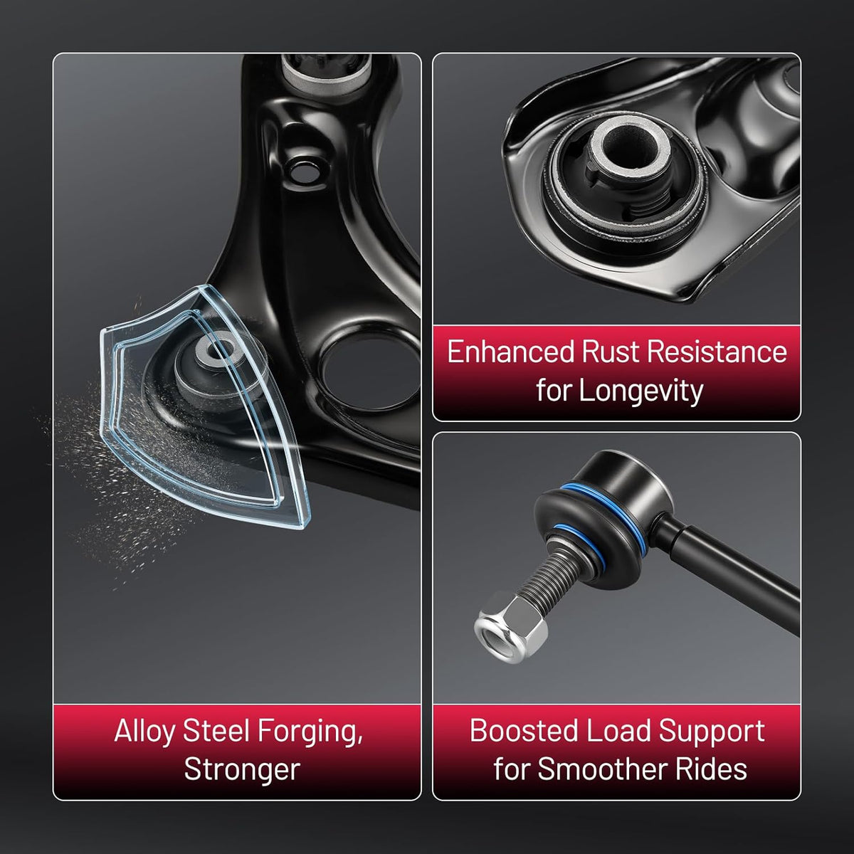 【Control Arm Features】 The control arm improves stability, handling, and driving comfort, with a protective finish that helps extend service life. Made from forged alloy steel, it delivers reliable performance, reduces noise, and ensures accurate fitment for safe and consistent driving