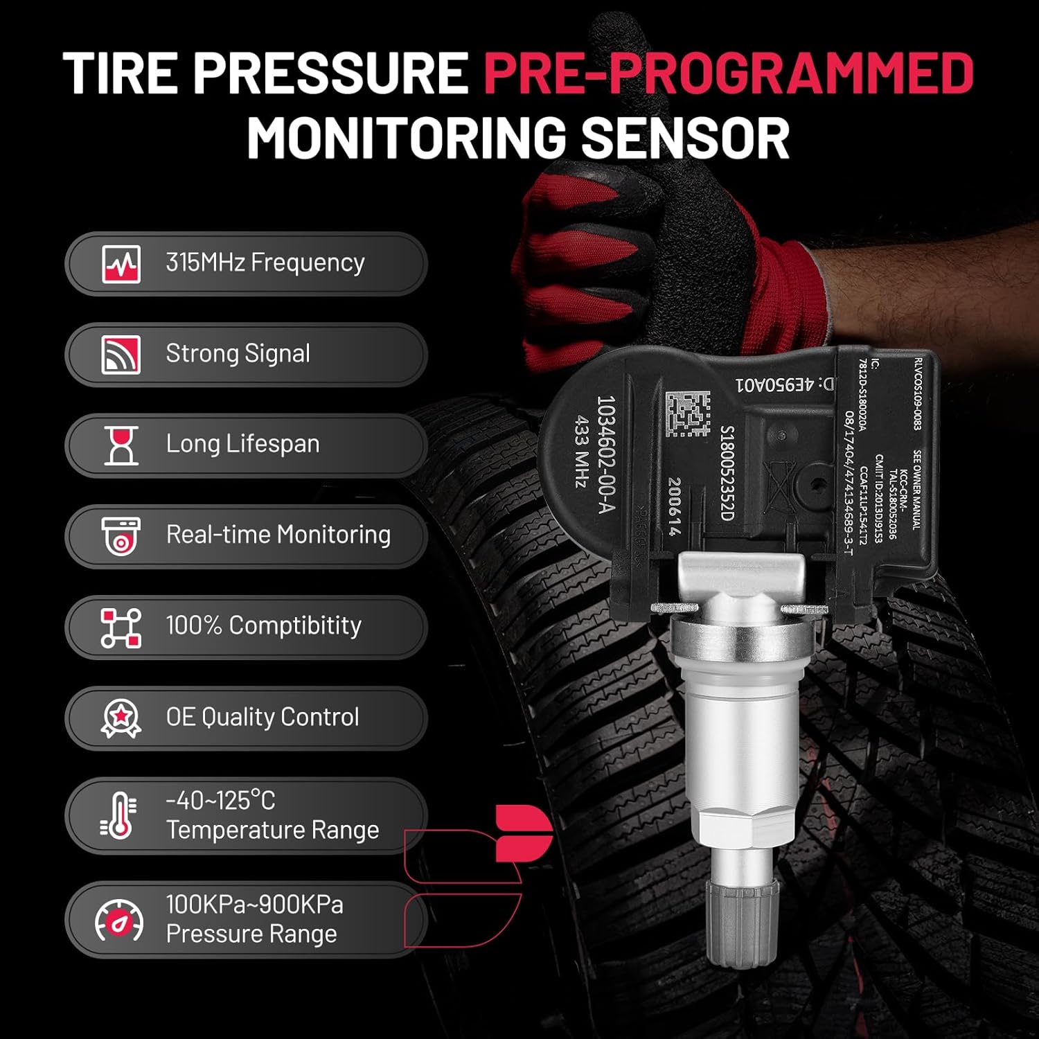 【High Performance & Reliability】: This Programmed TPMS Sensor is built with premium-grade components to ensure exceptional reliability, durability, and safety. Equipped with an automotive-grade battery providing a service life of over 3 years under normal use. Advanced chipset delivers strong signal stability and accurate real-time pressure readings. Engineered to withstand extreme temperatures from -49°F to 257°F, offering consistent performance even in harsh environments