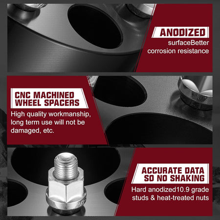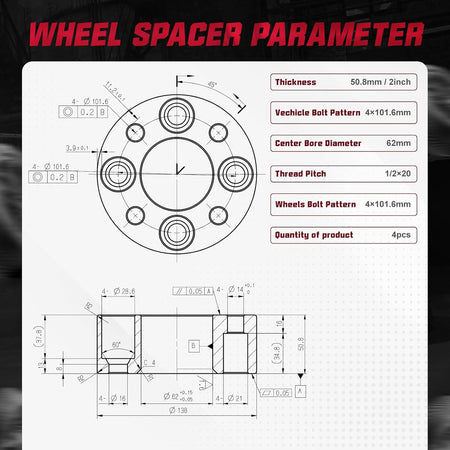 【Product Specs:】Set of 4 2 inch/50.8 mm Thickness | 4x101.6mm Wheel Bolt Pattern | 62mm Center Bore | 1/2-20 Thread Pitch | Protective gloves| Cleaning wire balls.