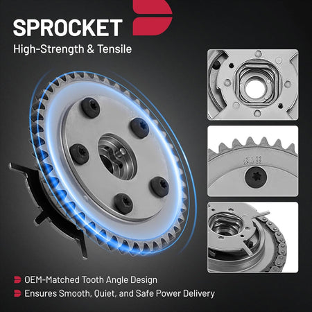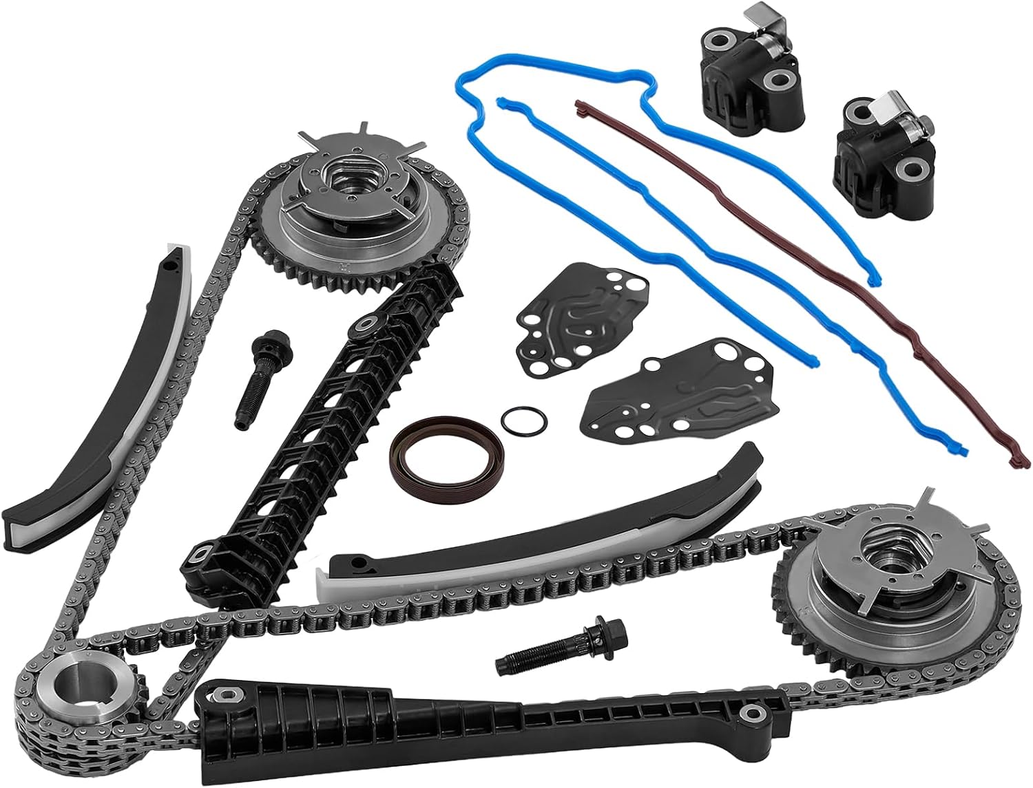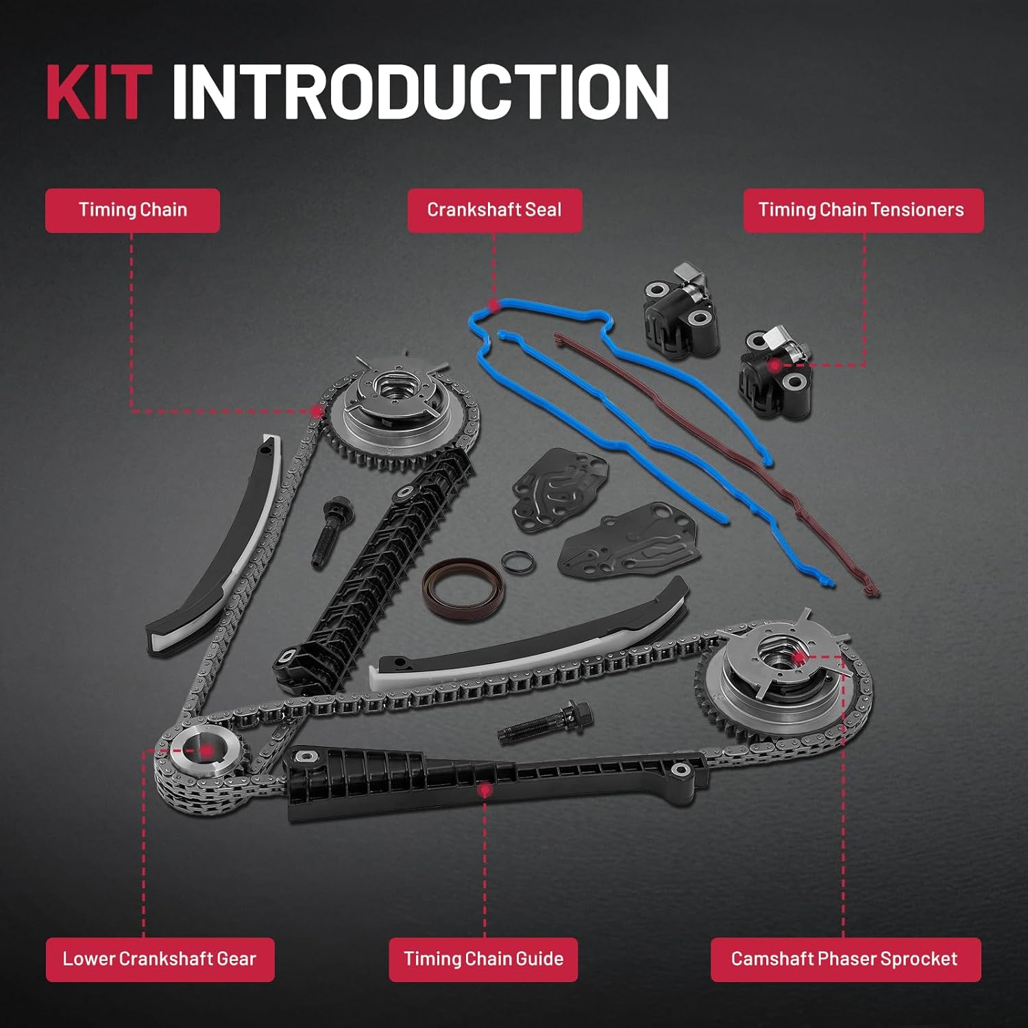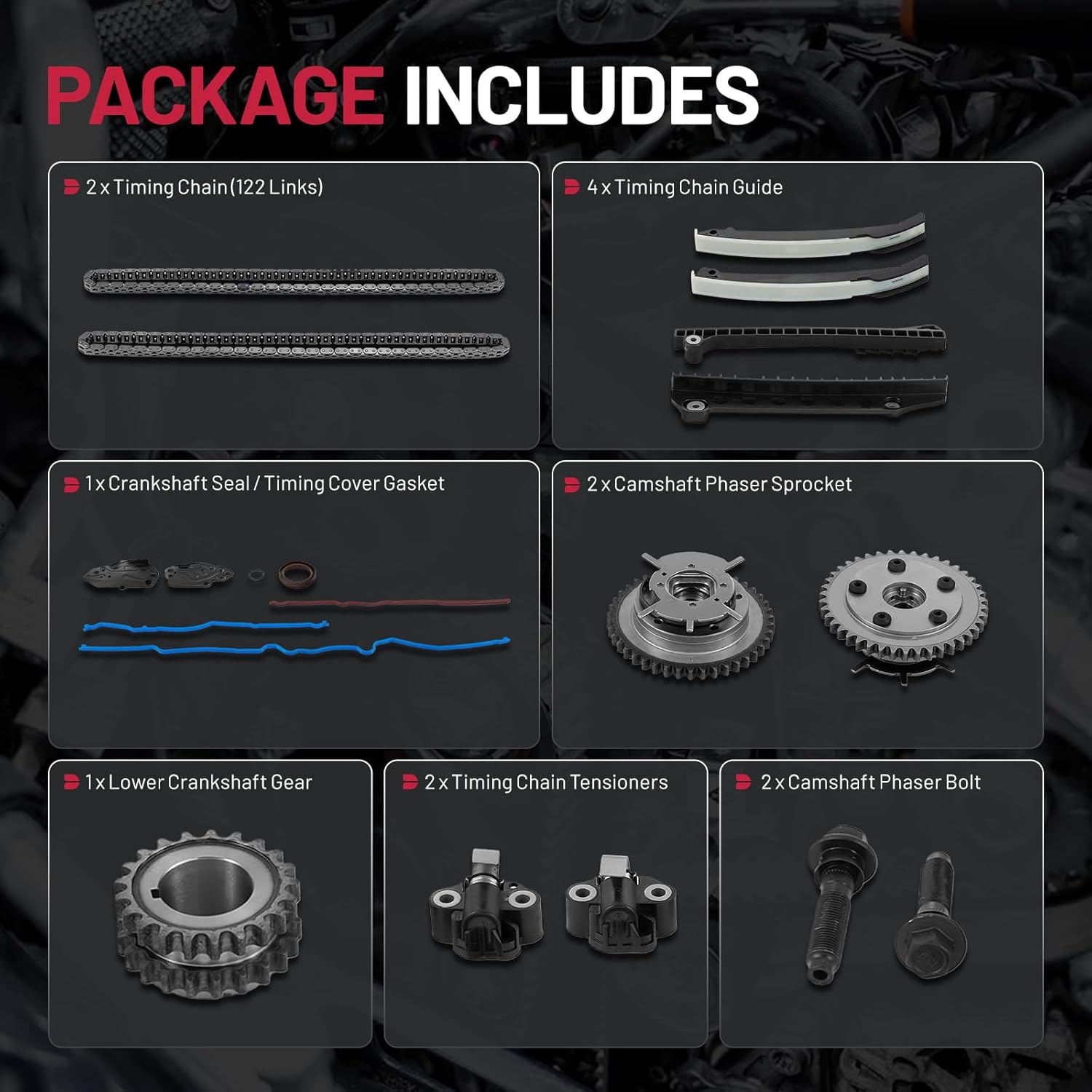 [Package Includes]: 2 x Timing Chain(122 Links),2 x Camshaft Phaser Sprocket, 2 x Camshaft Phaser Bolt, 1 x Lower Crankshaft Gear, 2 x Timing Chain Tensioners, 4 x Timing Chain Guide, 1 x Crankshaft Seal / Timing Cover Gasket