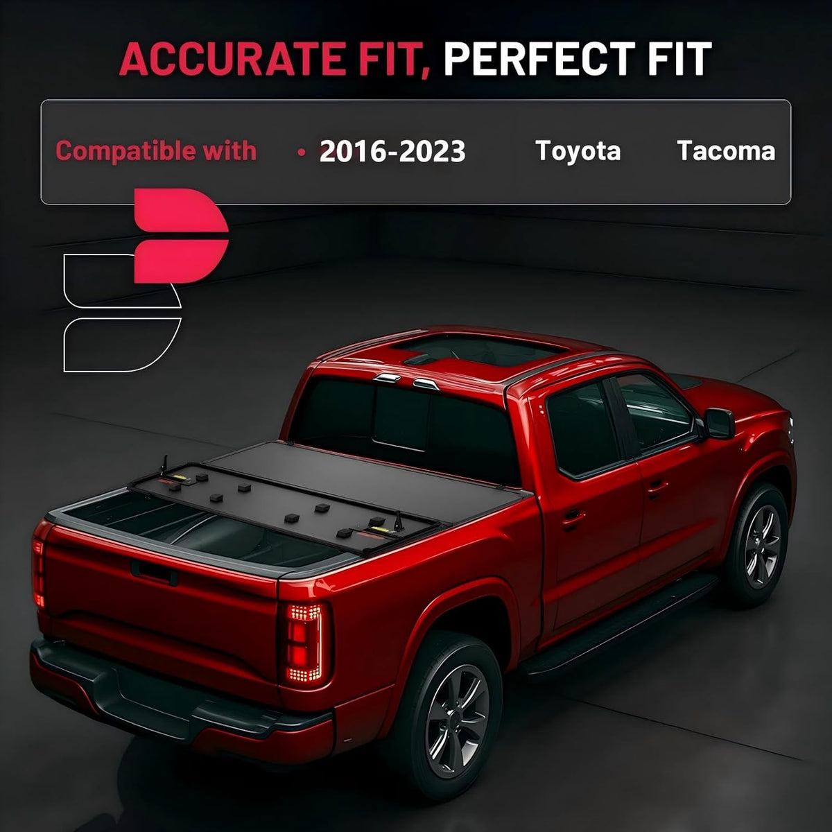 VEHICLE FITMENT: Customized to fit hard tri-fold tonneau cover is designed to fit Toyota Tacoma 2016-2023 models with a 5 ft bed (Excl. Trail Edition); This truck bed cover offers a seamless fit, ensuring your truck maintains its sleek appearance