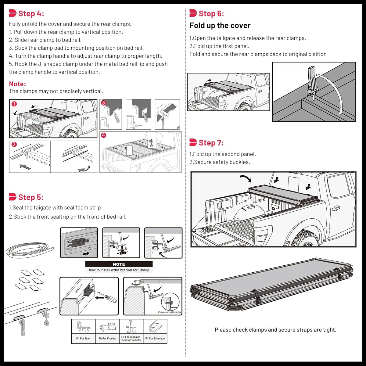 CLAMPS AND LATCHES ENSURE SAFETY AND SECURITY: Tonneau cover waith clips and latches quickly secure and lock the cover to keep it tight and noiseless and protect cargo from the elements, no drilling required supports up to 450 lbs