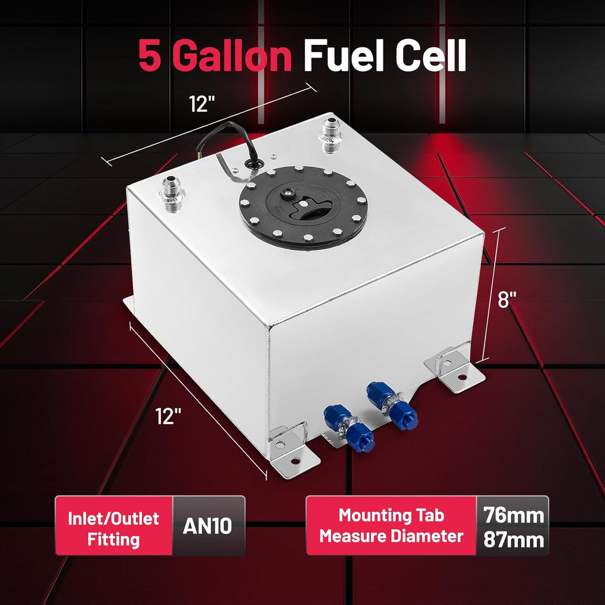 Material: Our fuel cell is made of 1060H24 aluminum and the fuel cap is made of plastic. Drift Fuel Cell Size: 12" (L) x 12" (W) x 8" (H), Mounting Tab Measure Diameter :76.01mm/87.36mm, Inlet/Outlet fitting: AN10.
