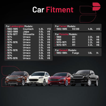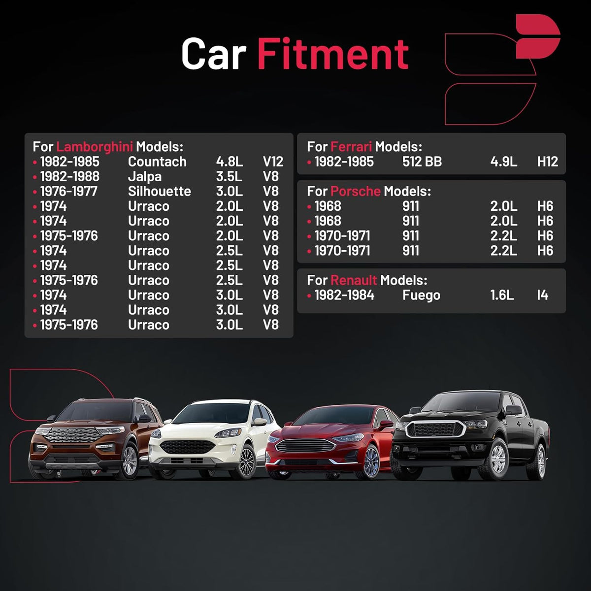 【Compatibility Information】:Spark Plug 5044 Compatible with Ferrari 1982-1985 512 BB; Compatible with Lamborghini 1982-1985 Countach, 1982-1988 Jalpa, 1976-1977 Silhouette, 1974-1976 Urraco; Compatible with Porsche 1968 911, 1970-1971 911; Compatible with Renault 1982-1984 Fuego.Please see images or details page for complete Compatibility information