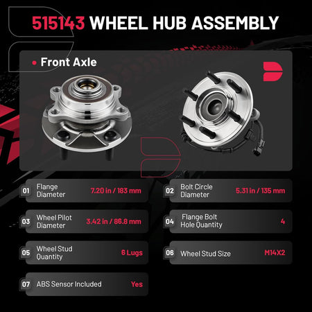 [PRODUCT SPECIFICATIONS] ①Position: Front; ②Flange Diameter: 7.20 in / 183 mm; ③Bolt Circle Diameter: 5.31 in / 135 mm; ④Wheel Pilot Diameter: 3.42 in / 86.8 mm; ⑤Flange Bolt Hole Quantity: 4; ⑥Wheel Stud Quantity: 6 Lugs; ⑦Flange Offset: 1.81 in / 46 mm; ⑧Wheel Stud Size: M14X2; ⑨ABS Sensor: Included