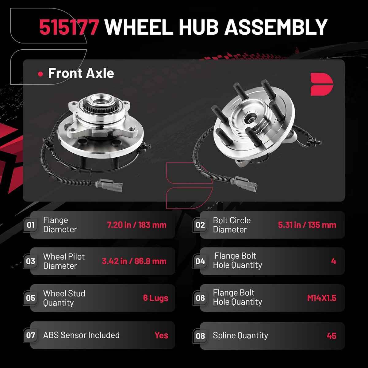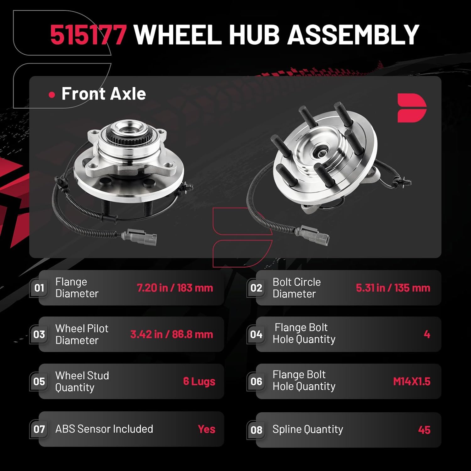 [PRODUCT SPECIFICATIONS] ①Position: Front; ②Flange Diameter: 7.20 in / 183 mm; ③Bolt Circle Diameter: 5.31 in / 135 mm; ④Wheel Pilot Diameter: 3.42 in / 86.8 mm; ⑤Flange Bolt Hole Quantity: 4; ⑥Wheel Stud Quantity: 6 Lugs; ⑦Flange Offset: 1.80 in / 45.6 mm; ⑧Wheel Stud Size: M14X1.5; ⑨Spline Quantity: 45; ⑩ABS Sensor: Included