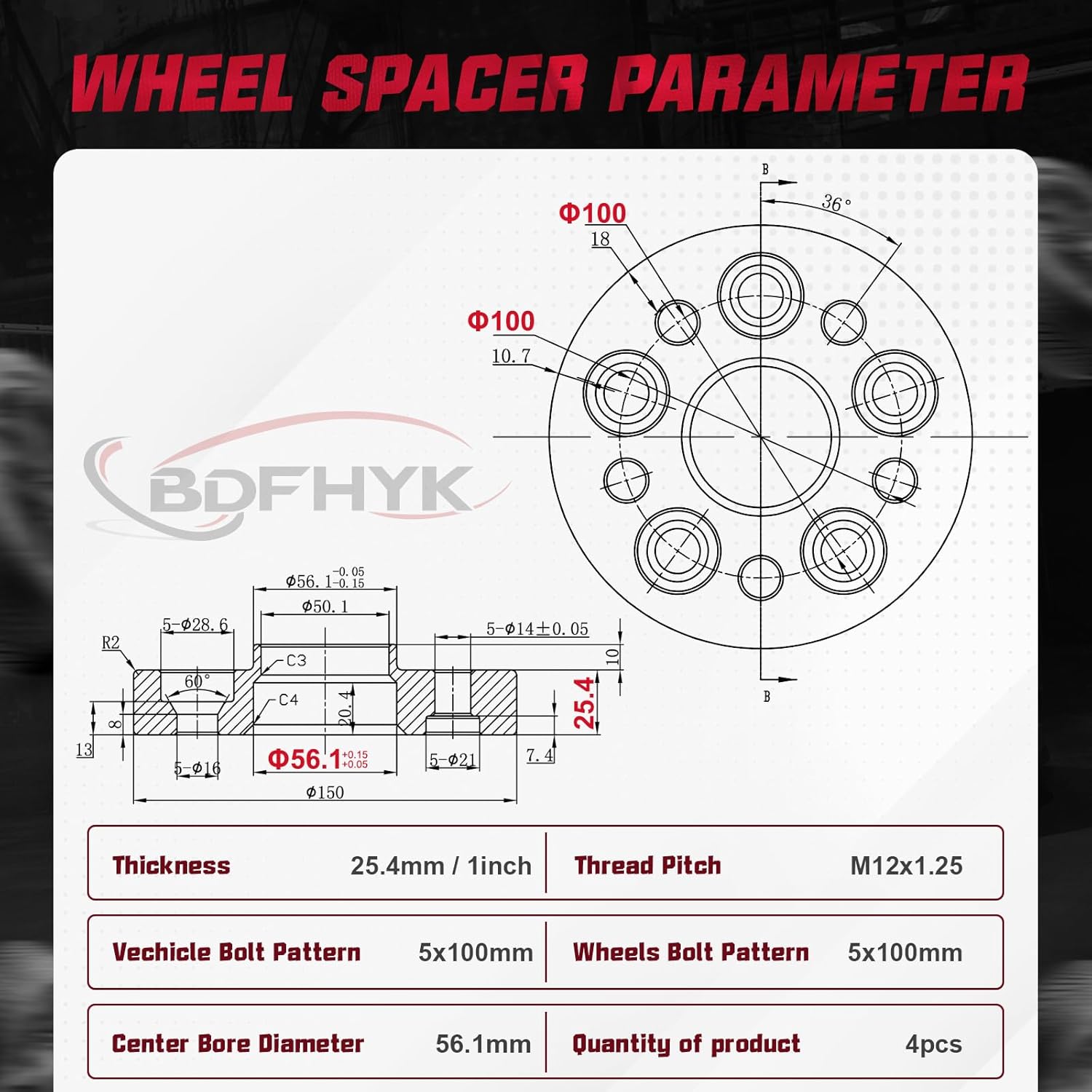 【Product Specs】:Set of 4 1 inch/25.4 mm Thickness | 5x100mm Wheel Bolt Pattern | 56.1mm Center Bore | M12x1.25 Thread Pitch | Protective gloves| Cleaning wire balls.