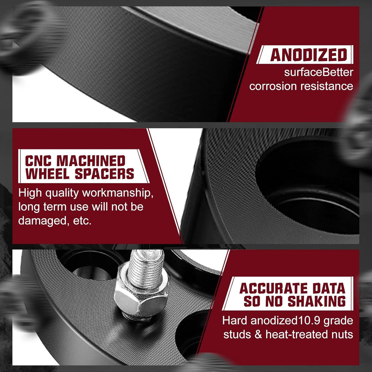 【Features of Hubcentric Wheel Spacer】: For your driving safety, we continue to improve, using aviation 6061 aluminum forging, CNC integrated molding, surface through anodic oxidation treatment, to ensure accuracy and wear resistance, 10.9 class bolts; all BDFHYK wheel spacer certified by IATF 16949:2016 quality system.