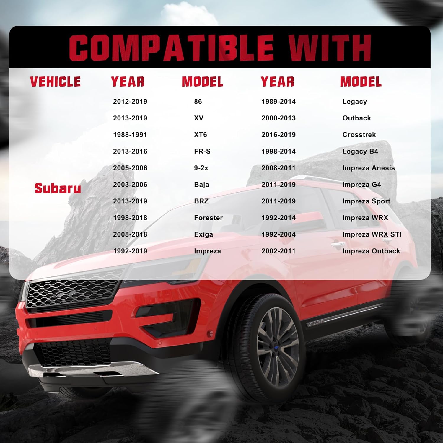 【Basic Info】:Wheel Spacers Compatible with Subaru 2003-2006 Baja,2016-2019 Crosstrek,2008-2018 Exiga,1998-2018 Forester,1992-2019 Impreza,1989-2014 Legacy,2000-2013 Outback,1988-1991 XT6,2013-2019 XV,2012-2019 86; Compatible with Scion 2013-2016 FR-S; Compatible with Saab 2005-2006 9-2x.Please check detail fitting info from pics or detail page. 12 months warranty and lifetime after-sales service are furnished after bought our products. Please choose a suitable one with confidence.