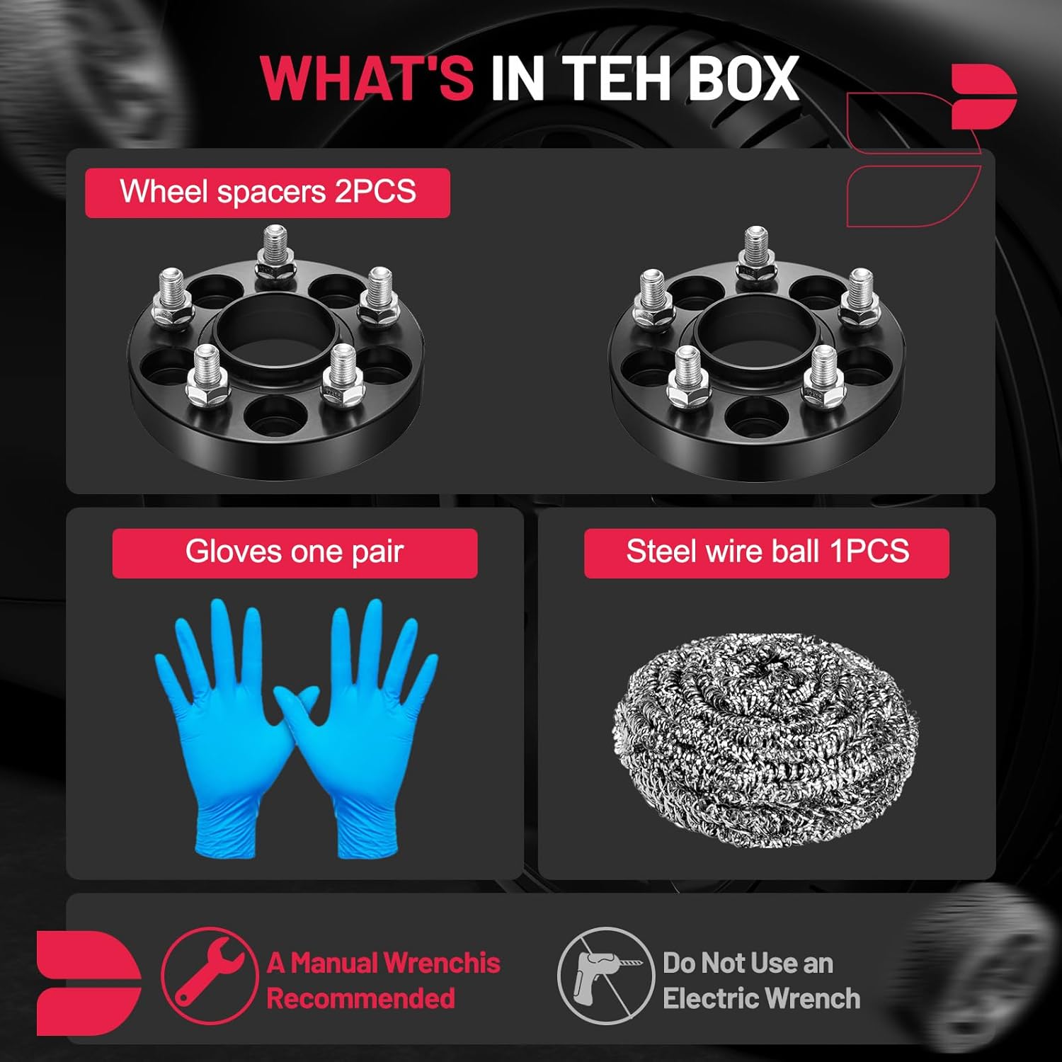 【Product Specs:】Set of 2 1 inch/25.4 mm Thickness | 5x108mm Wheel Bolt attern | 63.4mm Center Bore | M12x1.5 Thread Pitch | Protective gloves| Cleaning wire balls.