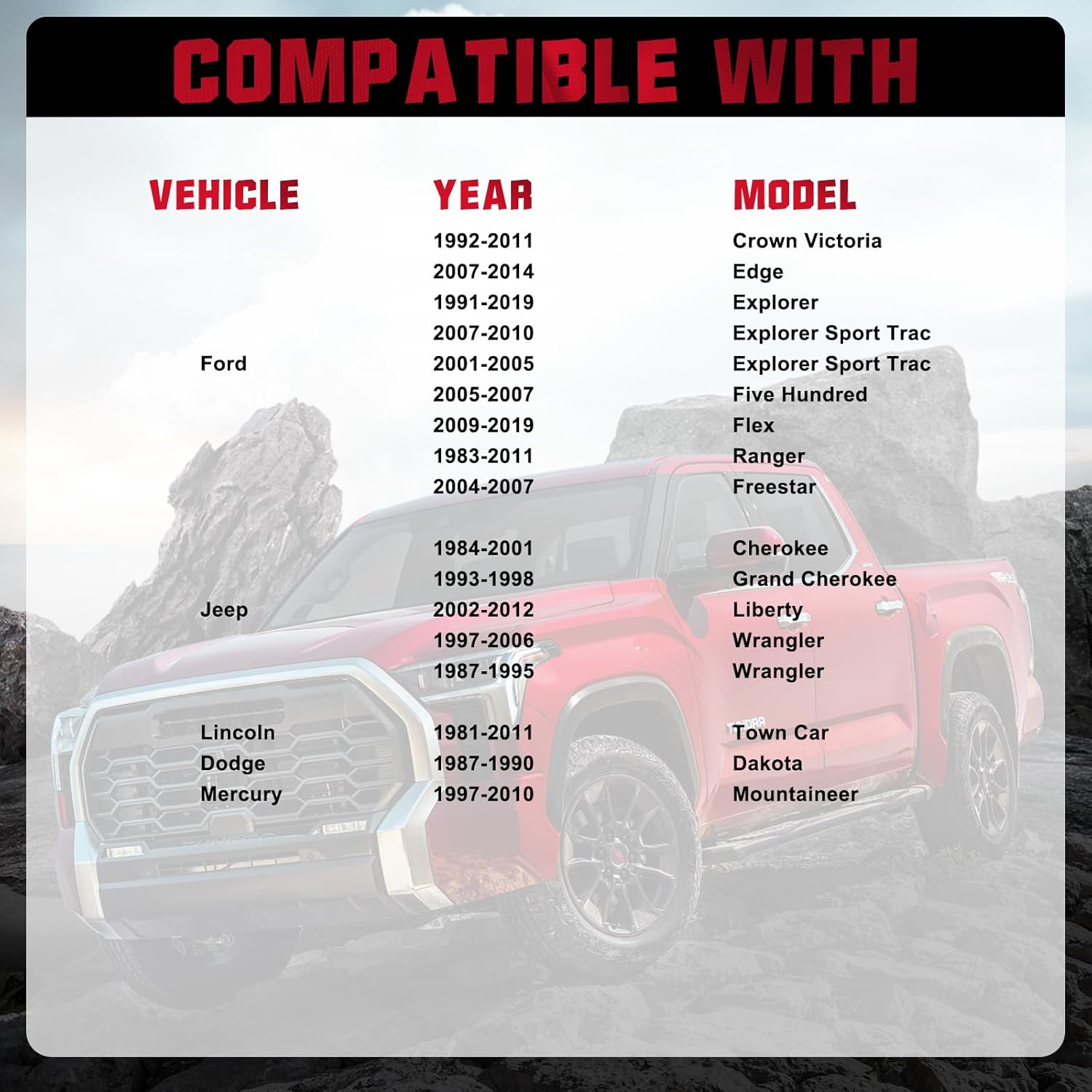 【Basic Info:】Wheel Spacers Compatible with Dakota, Crown Victoria Edge Explorer Explorer Sport Trac Five Hundred Flex Freestar Ranger; Compatible with Jeep Cherokee Grand Cherokee Liberty Wrangler; Compatible with Lincoln Town Car; Compatible with Mercury Mountaineer.Please check detail fitting info from pics or detail page. 12 months warranty and lifetime after-sales service are furnished after bought our products. Please choose a suitable one with confidence.