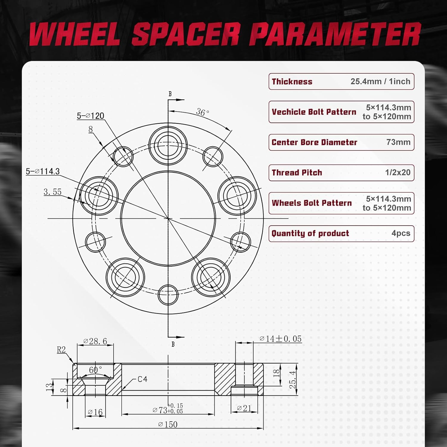 【Product Specs:】Set of 4 1 inch/25.4 mm Thickness | 5x114.3mm Vehicle Bolt Pattern| 5x120.65mm Wheel Bolt Pattern | 73mm Center Bore | 1/2-20 Thread Pitch | Protective gloves| Cleaning wire balls.