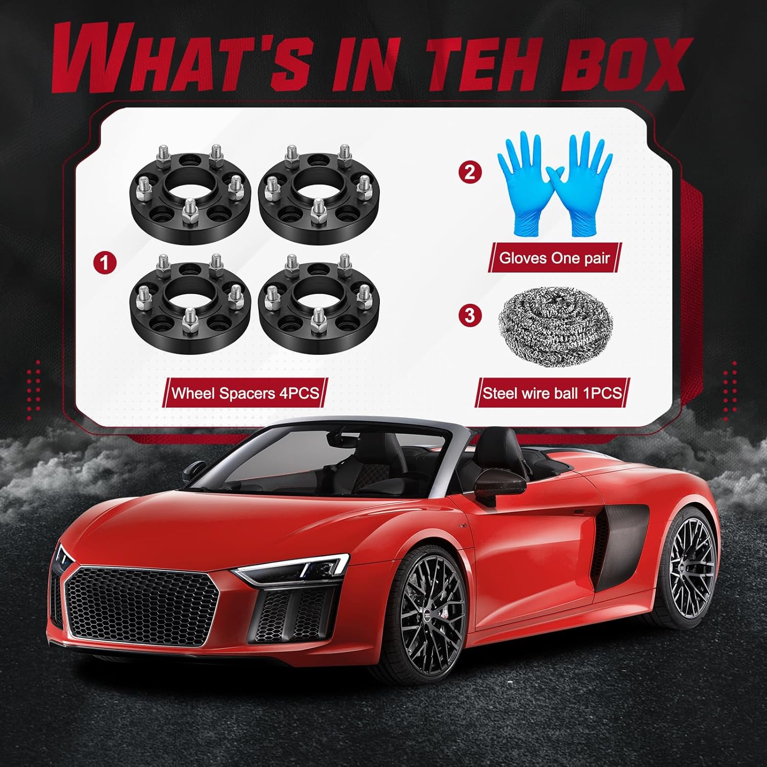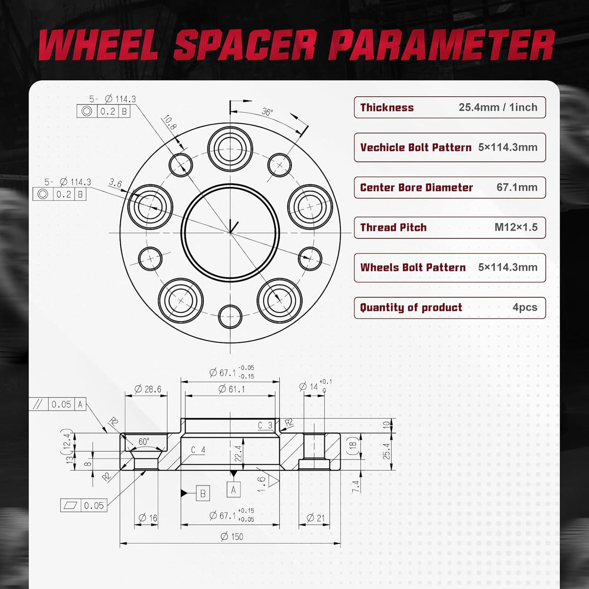 【Product Specs:】Set of 4 1inch /25.4mm Thickness | 5x114.3mm Wheel Bolt Pattern | 67.1mm Center Bore | M12x1.5 Thread Pitch | Protective gloves| Cleaning wire balls.