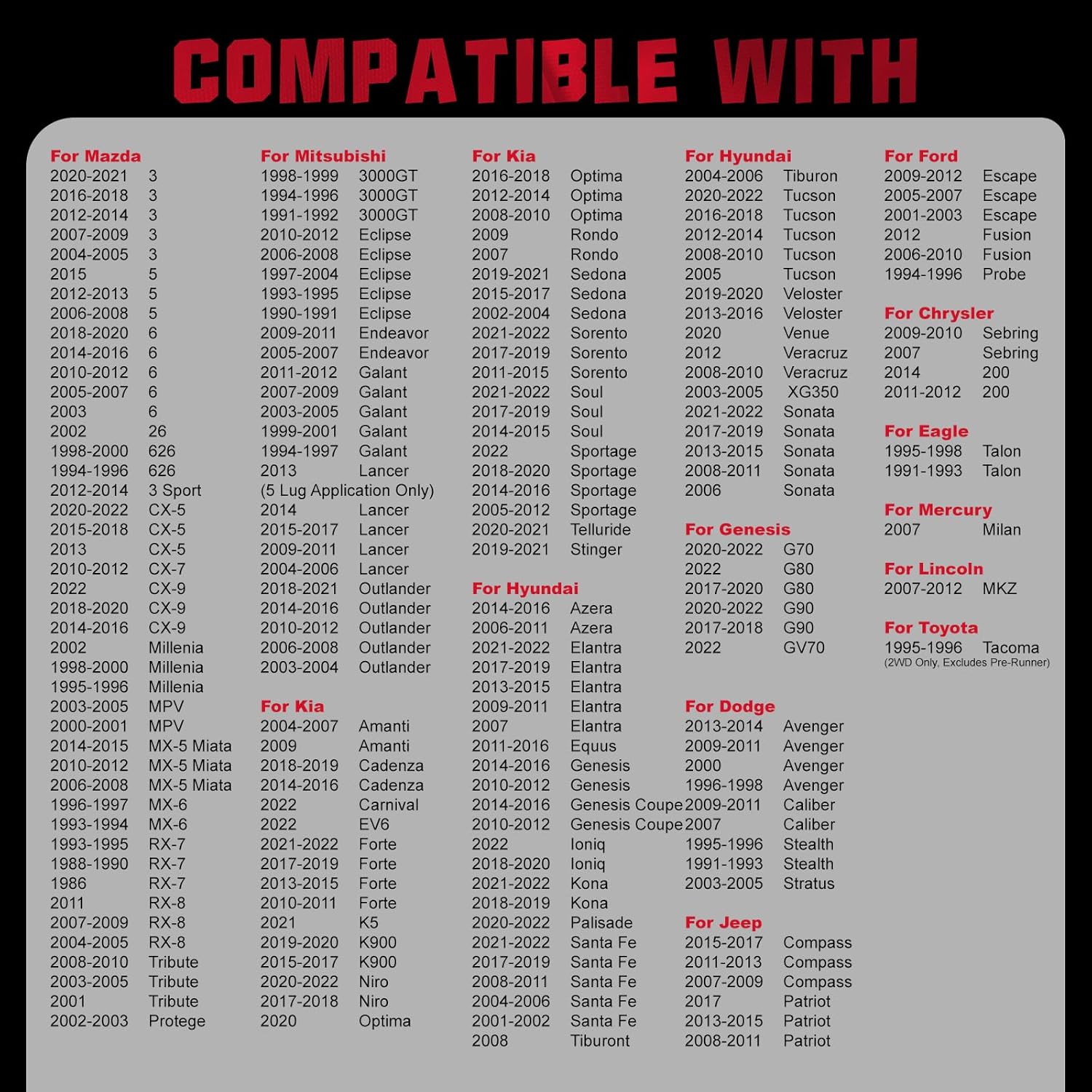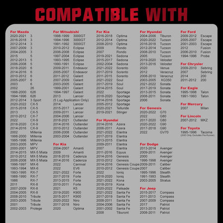 【Basic Info:】Wheel Spacers Compatible with Chrysler 200 Sebring; Compatible with Dodge Avenger Caliber Stealth Stratus; Compatible with Ford Escape Fusion Probe; Compatible with Jeep Compass Patriot; Compatible with Mazda 3 5 6 CX-5 CX-7 CX-9; Compatible with Genesis G70 G80 G90; Compatible with Lincoln MKZ; Compatible with Hyundai Azera Equus; Compatible with Kia Amanti Cadenza Carnival EV6 Forte K5 K900; Compatible with Toyota Tacoma.