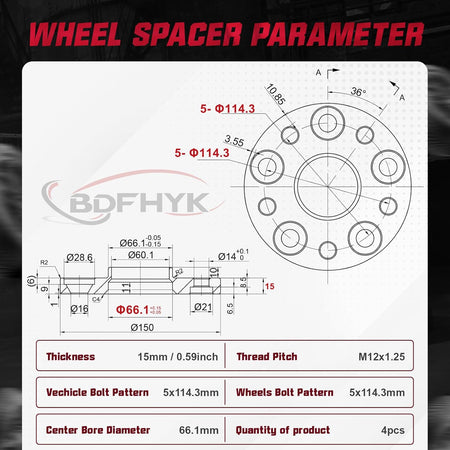 【Product Specs】:Set of 4 0.59 inch/15 mm Thickness | 5x114.3mm Wheel Bolt Pattern | 66.1mm Center Bore | M12*1.25 Thread Pitch | Protective gloves| Cleaning wire balls.
