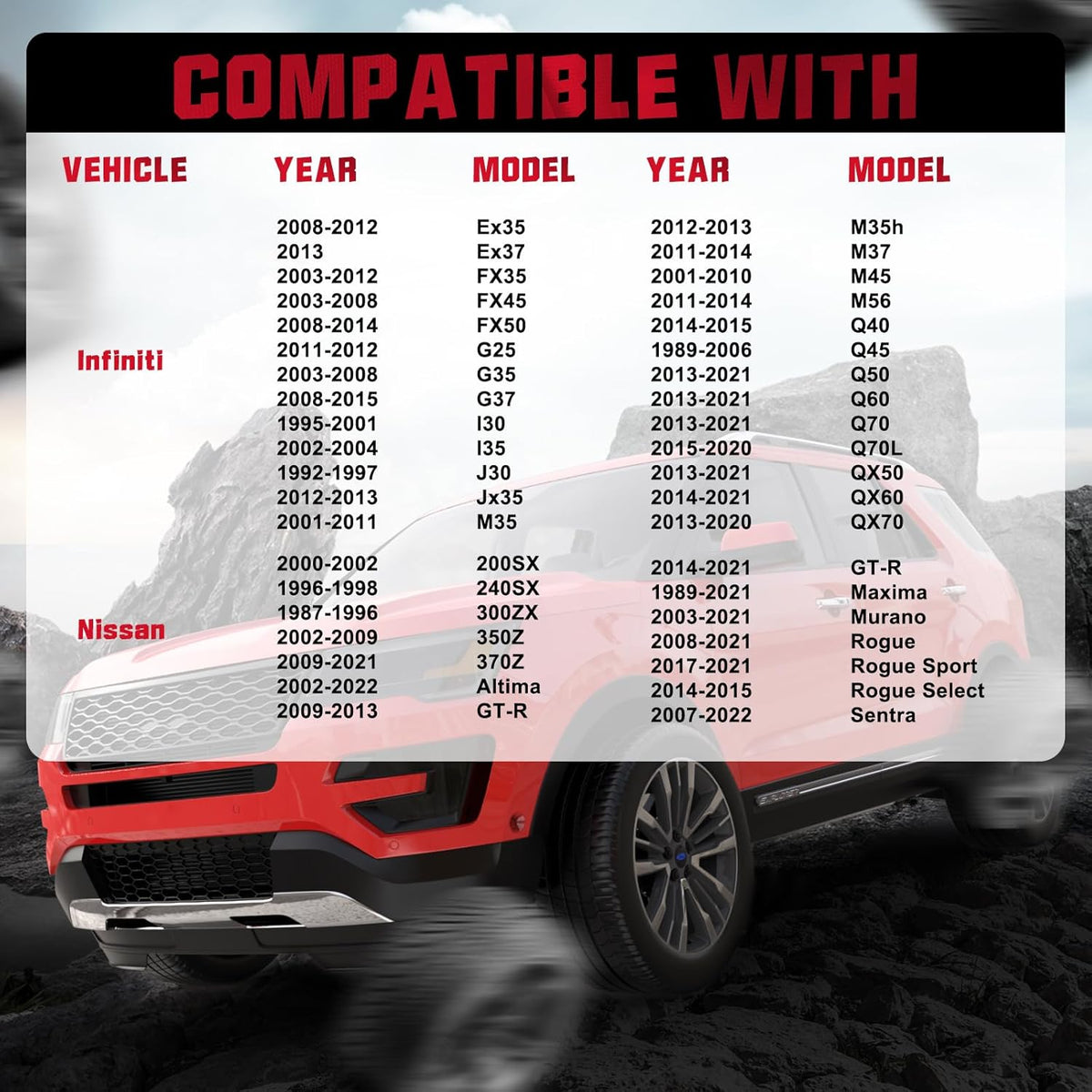 【Basic Info】:Wheel Spacers Compatible Infiniti Ex35 Ex37 FX35 FX45 FX50 G25 G35 G37 I30 I35 Jx35 M35 M35h M37 M45 Q40 Q50 Q60 Q70 Q70L QX50 QX60 QX70, Nissan 200SX 240SX 300ZX 350Z 370Z Altima GT-R Maxima Murano Rogue Sentra.Please check detail fitting info from pics or detail page. 12 months warranty and lifetime after-sales service are furnished after bought our products. Please choose a suitable one with confidence.